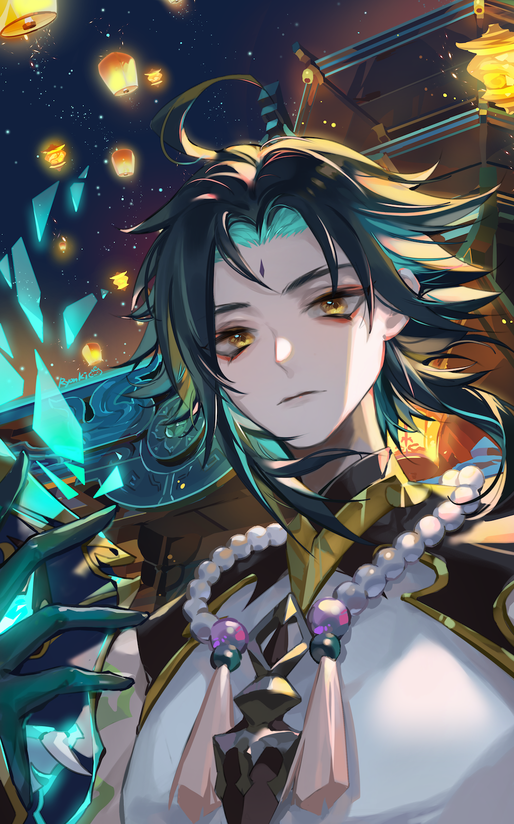 1boy ahoge architecture artist_name bead_necklace beads building chinese_commentary commentary_request east_asian_architecture expressionless eyeshadow facial_mark forehead_mark from_below genshin_impact gloves green_gloves green_hair hand_up highres holding holding_mask jewelry lantern light_particles looking_at_viewer makeup male_focus mask necklace night outdoors paper_lantern portrait red_eyeshadow ryonki short_hair signature sky sky_lantern solo tassel unworn_mask xiao_(genshin_impact) yellow_eyes