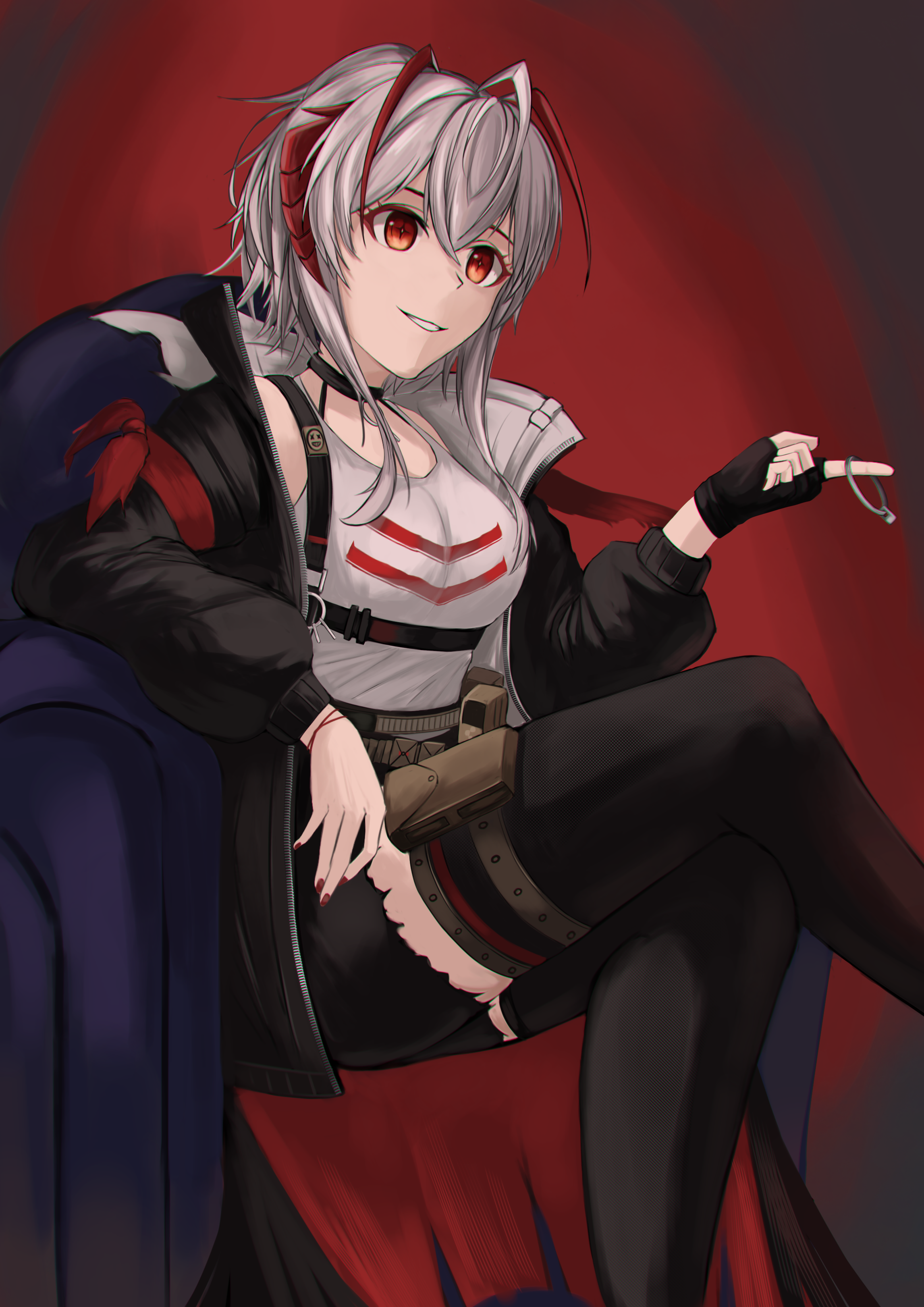 1girl absurdres ahoge antenna_hair arknights armchair barach black_choker black_gloves black_jacket black_thighhighs chair choker commentary feet_out_of_frame fingerless_gloves gloves grey_hair grey_tank_top grin hair_between_eyes highres horns jacket nail_polish official_alternate_costume open_clothes open_jacket orange_eyes pouch red_background red_nails short_hair smile solo standing tank_top thighhighs thighs w_(act_ii)_(arknights) w_(arknights)