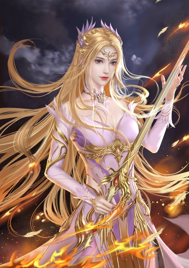 1girl armor armored_dress bare_shoulders blonde_hair cloud collar dark_background dark_cloud douluo_dalu dress falling_feathers feathers fire hair_ornament long_hair qian_renxue_(douluo_dalu) qian_renxue_zhuye smile solo sword weapon white_dress