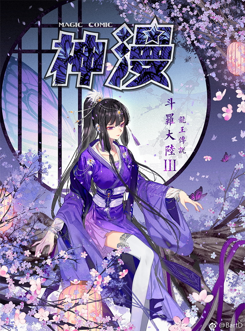 1girl bart._d black_hair bracelet branch bug butterfly cover cover_page douluo_dalu dress gu_yue_(douluo_dalu) hair_ornament insect jewelry lantern long_hair long_sleeves official_art ponytail purple_dress solo thighhighs upper_body