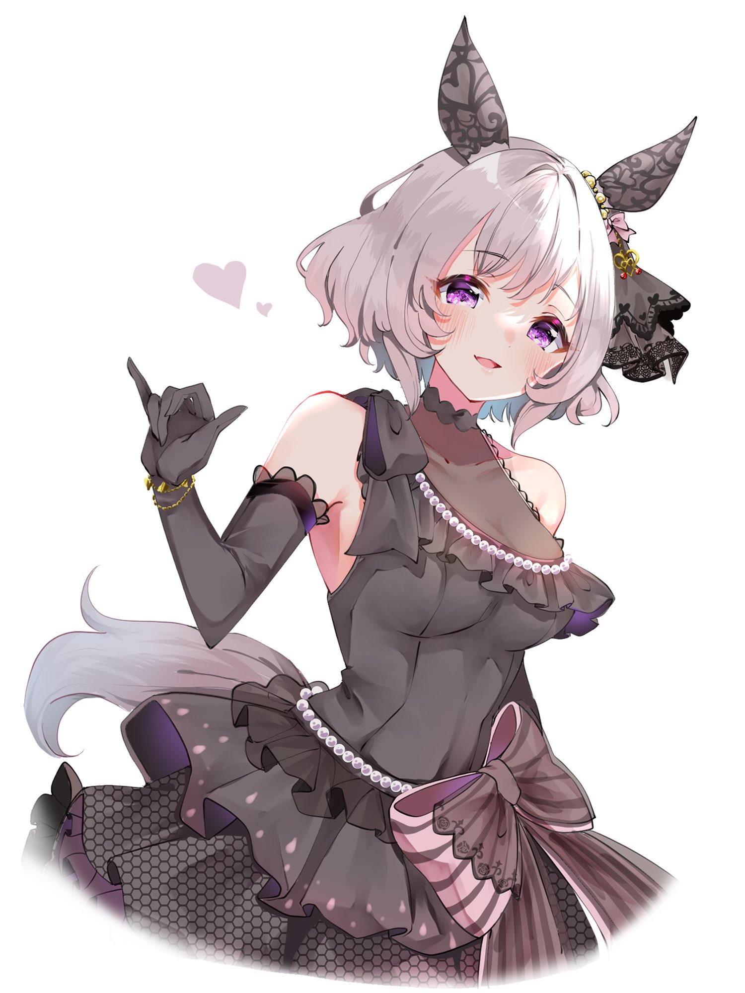 1girl animal_ears bare_shoulders black_dress black_gloves blush breasts cleavage curren_chan_(ma_sheri)_(umamusume) curren_chan_(sakutsuki_ma_cherie)_(umamusume) curren_chan_(umamusume) dress ear_covers elbow_gloves gloves grey_hair hairband highres horse_ears horse_girl looking_at_viewer medium_breasts official_alternate_costume purple_eyes see-through_clothes see-through_cleavage short_hair smile solo umamusume yuanagae
