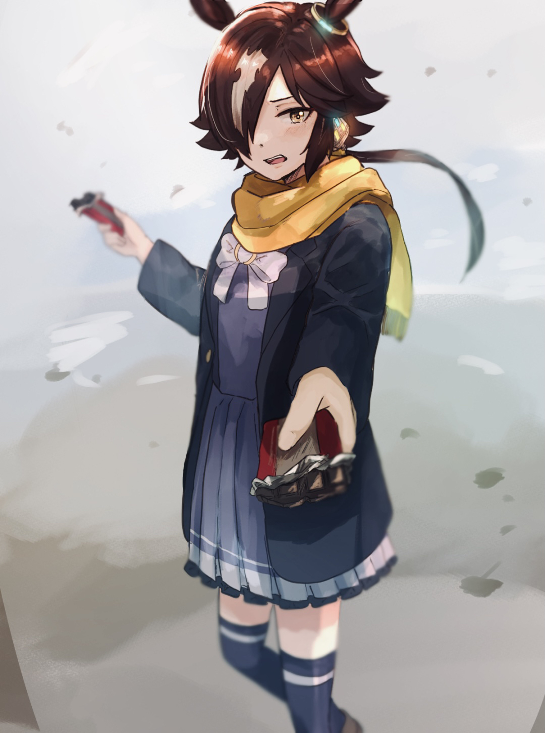1girl animal_ears black_jacket black_shirt black_skirt bow bowtie brown_hair chocolate food hair_over_one_eye highres holding holding_food horse_ears horse_girl jacket long_hair looking_at_viewer open_mouth outdoors ponytail sako_(oyatutabero) scarf shirt skirt solo thighhighs umamusume vodka_(umamusume) white_bow white_bowtie yellow_scarf