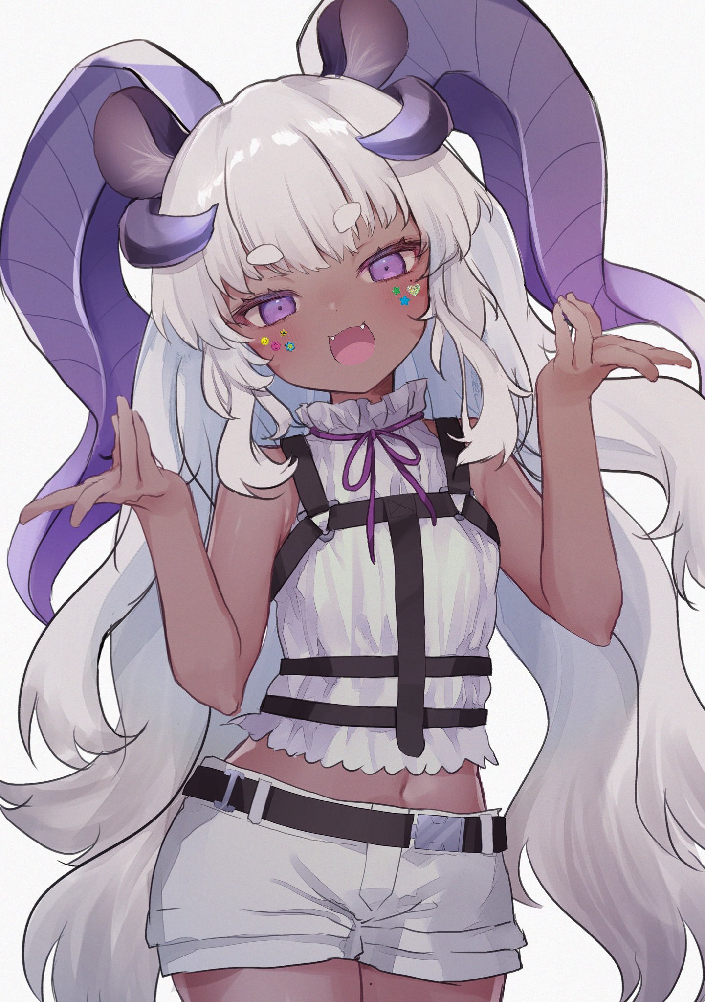 1girl animal_ear_fluff animal_ears arms_up character_request dark-skinned_female dark_skin demon_girl demon_horns fangs fushimi_sameta grey_hair highres horns long_hair midriff navel open_mouth pink_eyes project_blue_(vtuber) shirt short_shorts shorts sleeveless sleeveless_shirt smile solo sugar_glider_(project_blue) thighs virtual_youtuber white_shirt white_shorts
