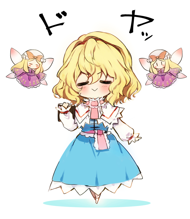 1girl :> alice_margatroid blonde_hair blue_dress blush book capelet closed_mouth doll doyagao dress closed_eyes full_body grimoire_of_alice hair_between_eyes hairband holding holding_book long_sleeves piyokichi red_hairband short_hair simple_background smile smug solo touhou touhou_lostword white_capelet