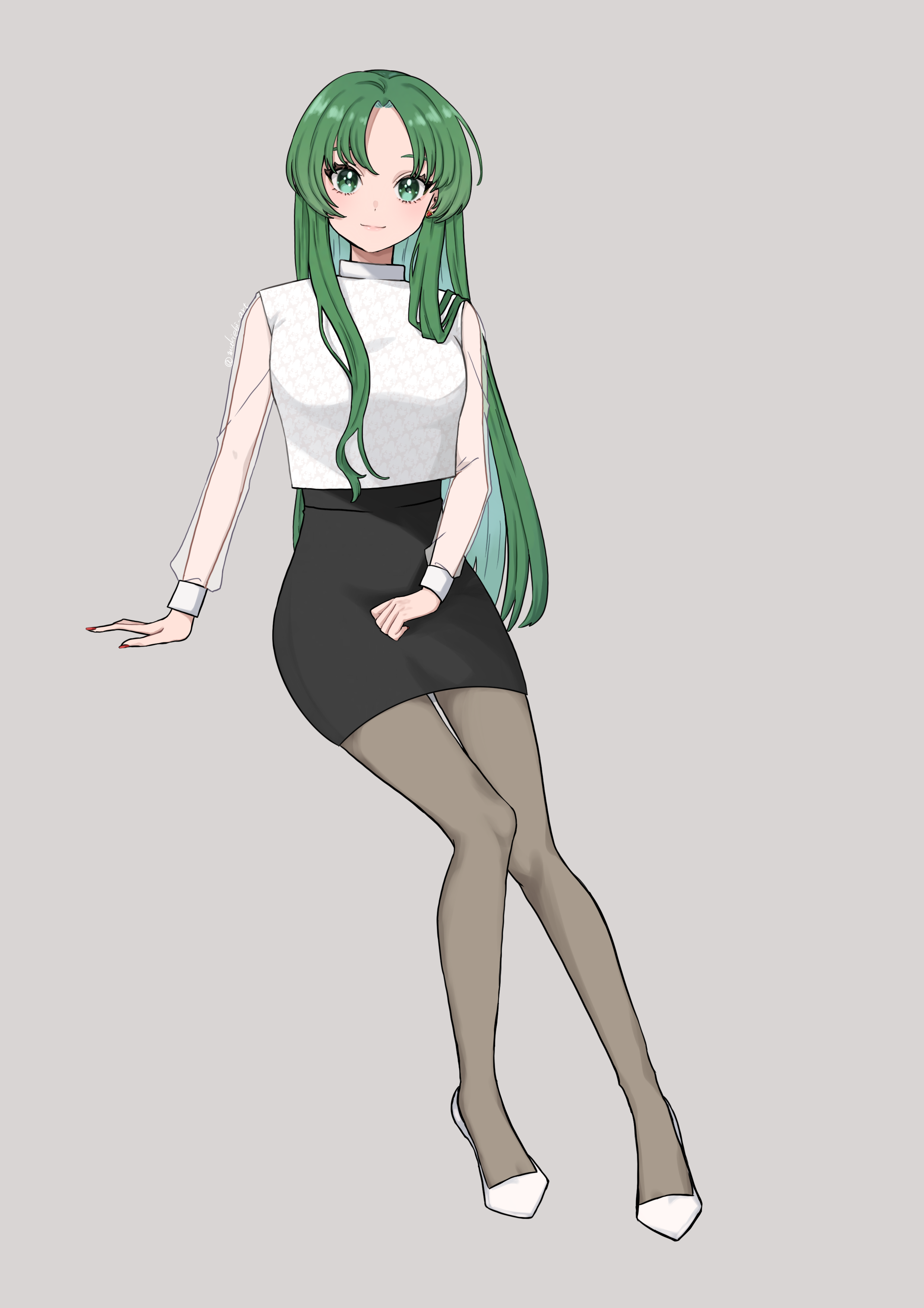 1girl absurdres bad_id bad_pixiv_id black_skirt closed_mouth earrings full_body green_eyes green_hair grey_background grey_pantyhose hair_down high-waist_skirt high_heels highres higurashi_no_naku_koro_ni invisible_chair jewelry long_hair long_sleeves looking_at_viewer miniskirt mukiebi_art nail_polish pantyhose pencil_skirt pumps red_nails see-through_clothes see-through_sleeves shirt simple_background sitting skirt smile solo sonozaki_shion straight_hair twitter_username very_long_hair white_footwear white_shirt