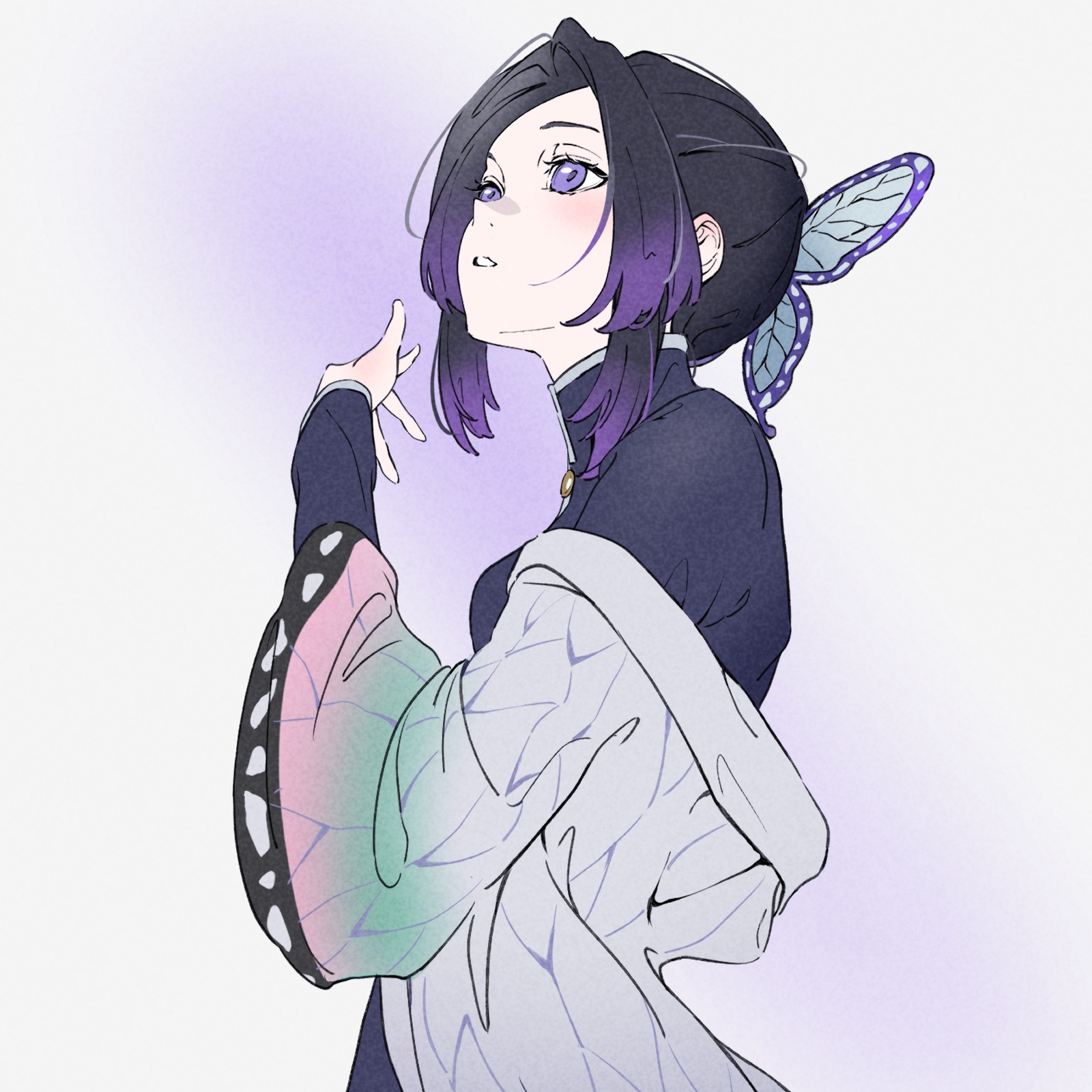 1girl black_hair black_jacket butterfly_hair_ornament demon_slayer_uniform from_side gradient_hair hair_intakes hair_ornament haori highres jacket japanese_clothes kimetsu_no_yaiba kochou_shinobu long_sleeves looking_up multicolored_hair natsume_hinako off_shoulder parted_lips purple_eyes purple_hair short_hair sketch solo upper_body