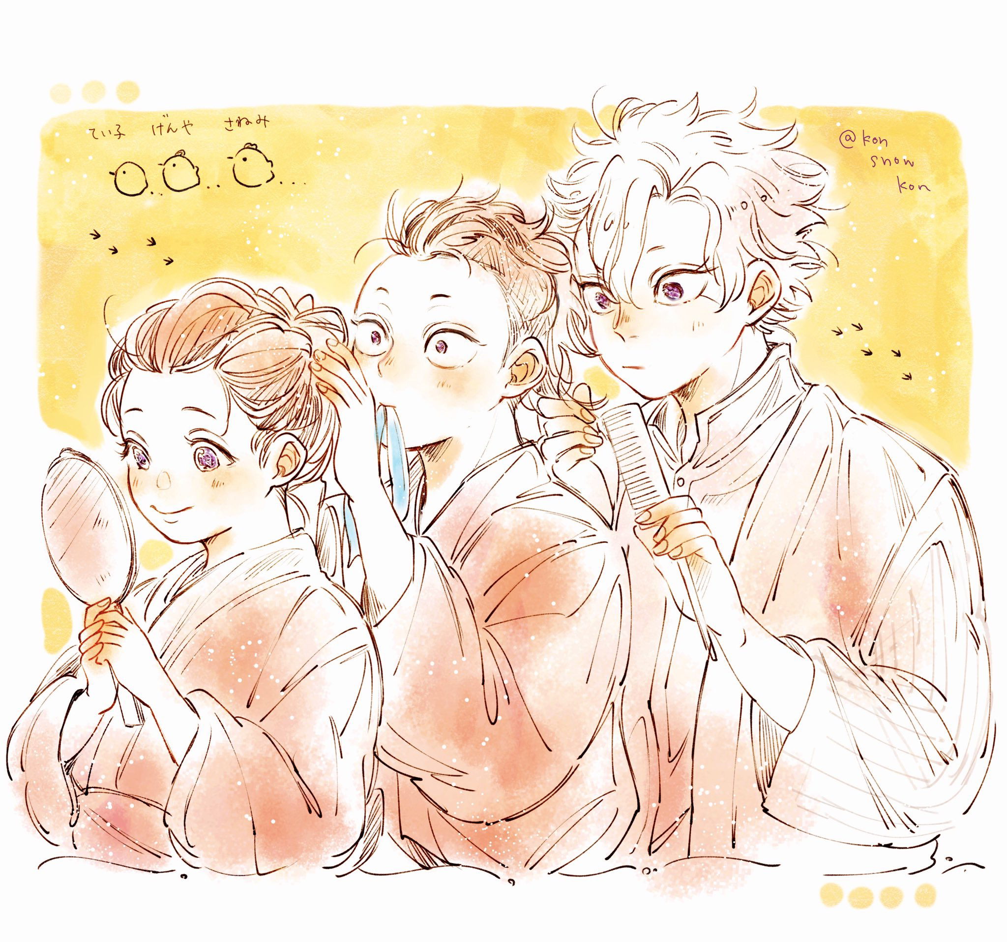 1girl 2boys aged_down baby_animal bird black_hair blue_ribbon brother_and_sister brothers brown_hair brushing_another's_hair brushing_hair character_name chick comb hair_pulled_back hand_mirror hands_up highres holding holding_another's_hair holding_comb holding_mirror japanese_clothes kimetsu_no_yaiba kimono konsobastew lineup long_sleeves looking_at_another mirror mohawk mouth_hold multiple_boys purple_eyes ribbon ribbon_in_mouth shinazugawa_genya shinazugawa_sanemi shinazugawa_teiko siblings smile twitter_username tying_hair updo upper_body vest white_hair yellow_background