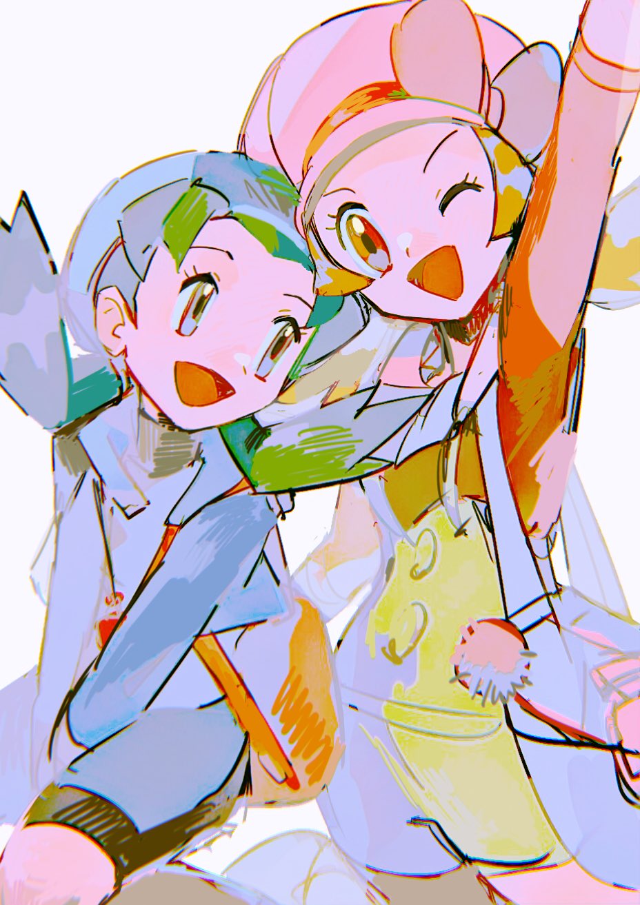 2girls aqua_hair bag bike_shorts brown_eyes brown_hair commentary handbag hat highres hinann_bot kris_(pokemon) looking_at_another low_twintails lyra_(pokemon) multiple_girls nintendo one_eye_closed open_mouth pokemon pokemon_masters_ex red_eyes short_hair simple_background smile twintails white_background