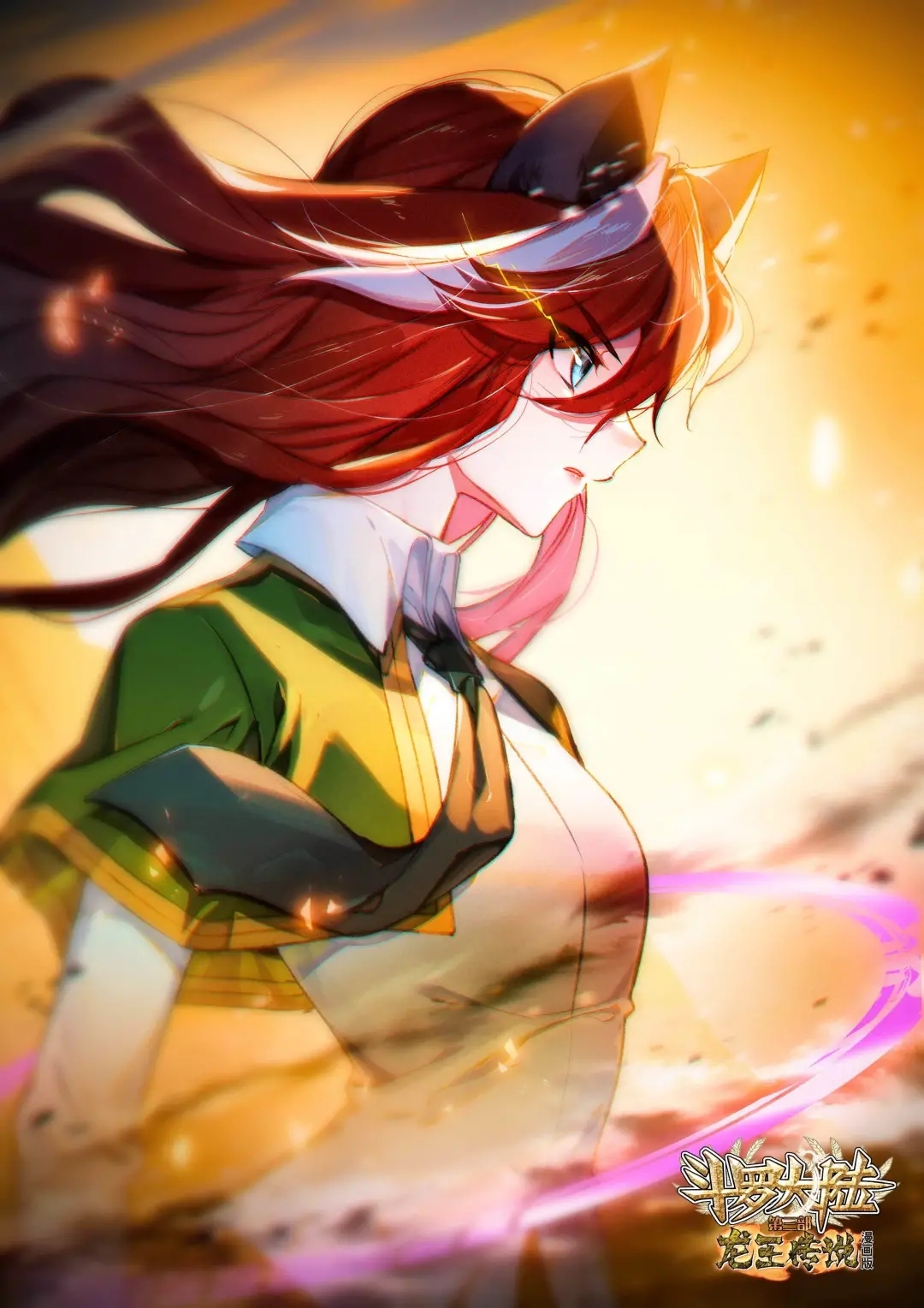 1girl animal_ears bad_link bart._d blue_eyes cat_ears collared_shirt cover cover_page douluo_dalu dr._daji from_side green_shawl highres light long_sleeves multicolored_hair necktie official_art open_mouth red_hair shawl shirt smoke third-party_source two-tone_hair white_shirt wu_siduo_(douluo_dalu)