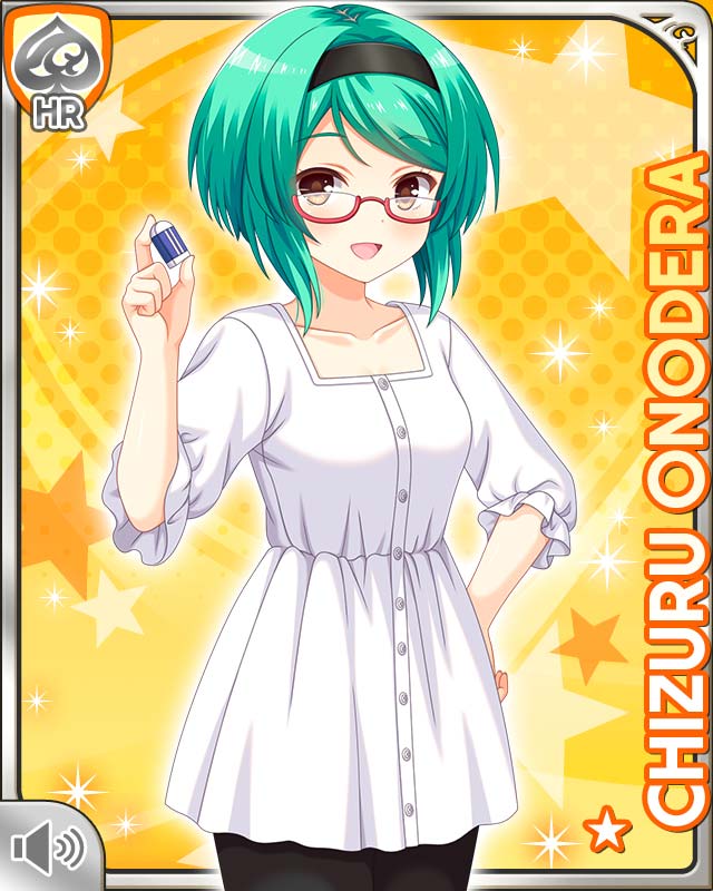 1girl black_headband black_pantyhose brown_eyes card_(medium) collarbone dress girlfriend_(kari) glasses green_hair headband official_art onodera_chizuru open_mouth pantyhose qp:flapper red-framed_eyewear short_hair smile solo white_dress yellow_background