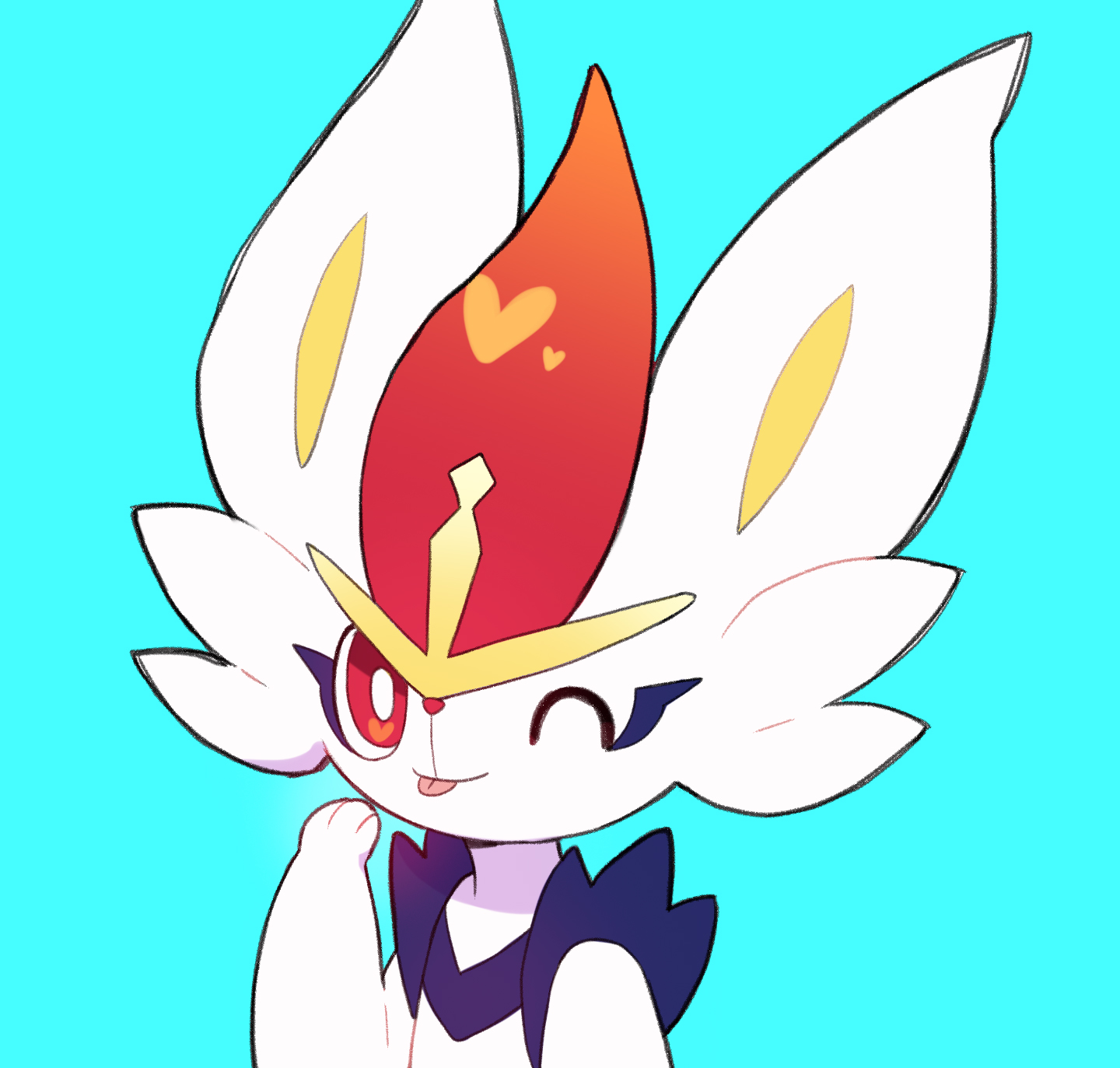 blue_background bright_pupils cinderace closed_mouth colaoud commentary_request gen_8_pokemon hand_up highres korean_commentary looking_at_viewer nintendo one_eye_closed pokemon pokemon_(creature) red_eyes simple_background smile solo tongue tongue_out upper_body white_pupils