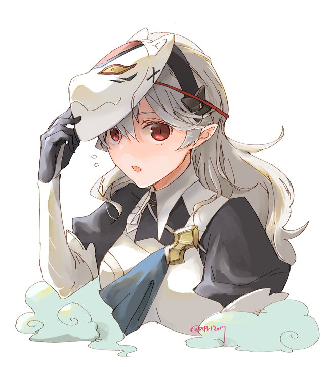1girl black_gloves black_hairband female_corrin_(fire_emblem) cropped_torso fire_emblem fire_emblem_fates fox_mask gloves hair_between_eyes hairband long_hair mask nintendo open_mouth red_eyes robaco simple_background sketch solo twitter_username white_background white_hair