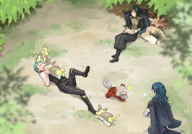 1girl 2boys black_jacket black_pants blue_hair book book_on_lap caspar_von_bergliez closed_eyes crossover day female_byleth_(fire_emblem) fire_emblem fire_emblem:_three_houses from_above gen_5_pokemon gen_8_pokemon green_hair hand_on_own_hip hisuian_growlithe jacket linhardt_von_hevring long_hair long_sleeves lying multiple_boys nintendo on_back outdoors pants parted_bangs pokemon pokemon_(creature) robaco short_hair sitting standing stoutland straight_hair white_sleeves yamper