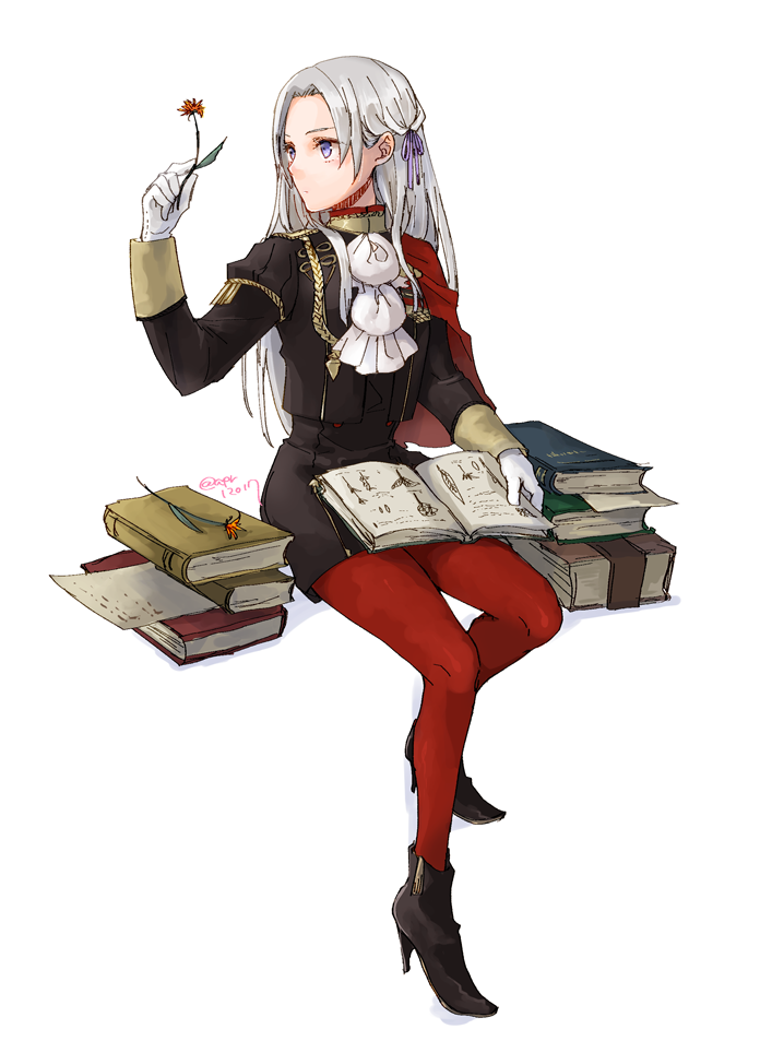 1girl black_jacket black_shorts book book_on_lap book_stack braid closed_mouth edelgard_von_hresvelg fire_emblem fire_emblem:_three_houses flower french_braid grey_eyes hair_ribbon high_heels holding holding_flower invisible_chair jacket long_hair long_sleeves nintendo pantyhose purple_ribbon red_pantyhose ribbon robaco short_shorts shorts simple_background sitting solo very_long_hair white_background white_hair