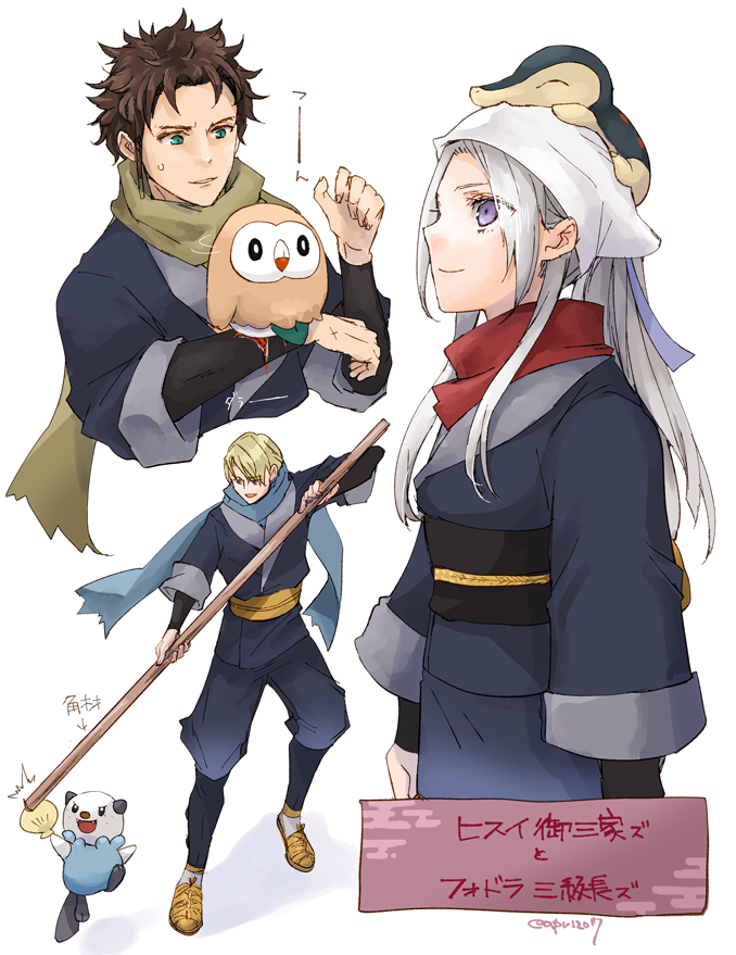 1girl 2boys akari_(pokemon) akari_(pokemon)_(cosplay) black_hair blonde_hair claude_von_riegan cosplay crossover cyndaquil dimitri_alexandre_blaiddyd edelgard_von_hresvelg fire_emblem fire_emblem:_three_houses gen_2_pokemon gen_5_pokemon gen_7_pokemon green_eyes grey_kimono grey_pants headscarf holding japanese_clothes kimono long_hair multiple_boys nintendo obi on_head oshawott pants pokemon pokemon_(creature) pokemon_legends:_arceus pokemon_on_arm pokemon_on_head purple_eyes robaco rowlet sash short_hair sketch white_hair white_headscarf