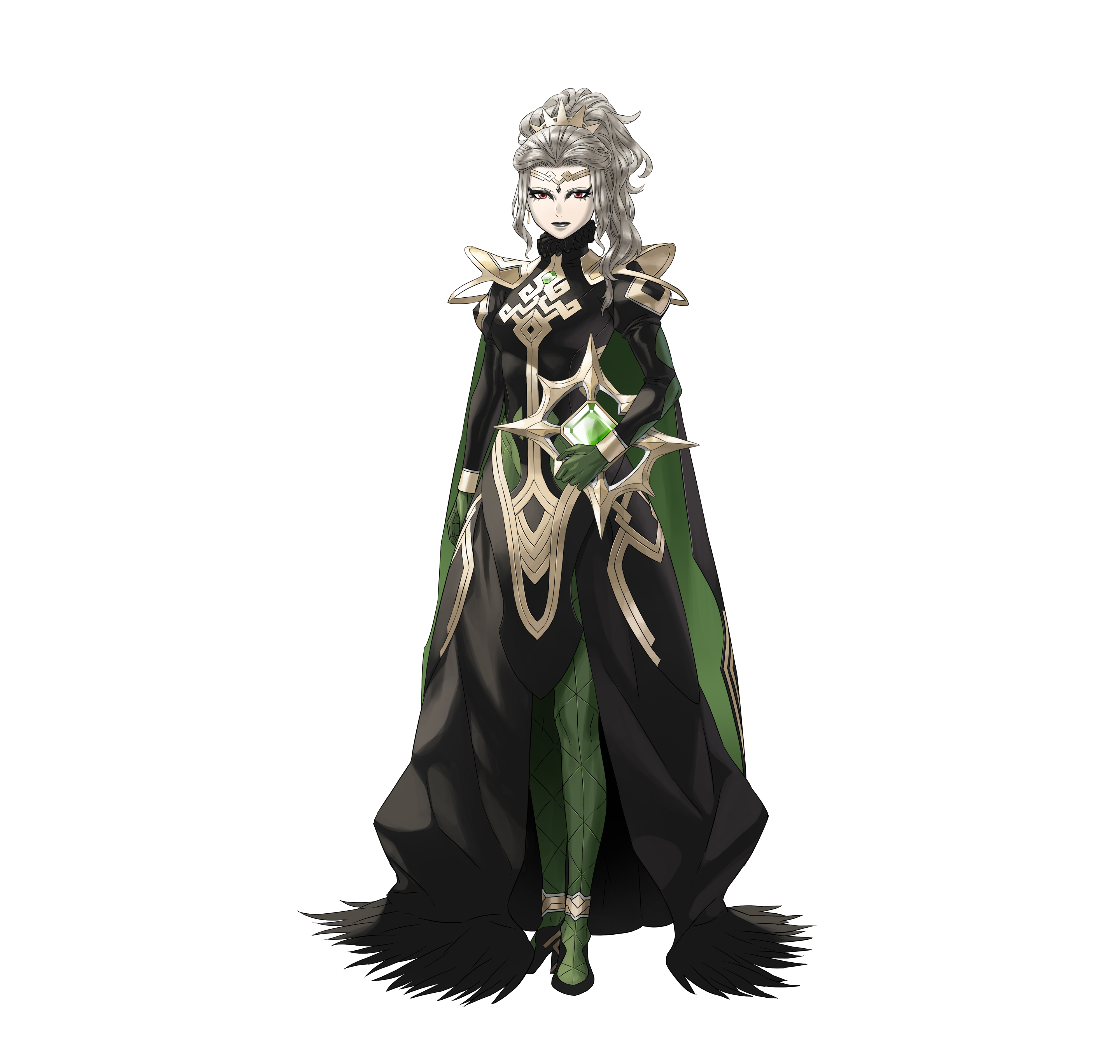 1girl absurdres black_dress book cape closed_mouth dress fire_emblem fire_emblem_heroes fishnet_legwear fishnets full_body gloves gold_trim green_legwear hair_ornament high_heels highres holding holding_book jewelry kozaki_yuusuke letizia_(fire_emblem) long_hair long_sleeves looking_at_viewer makeup nintendo official_art ponytail puffy_sleeves red_eyes simple_background smile solo standing tiara turtleneck white_background
