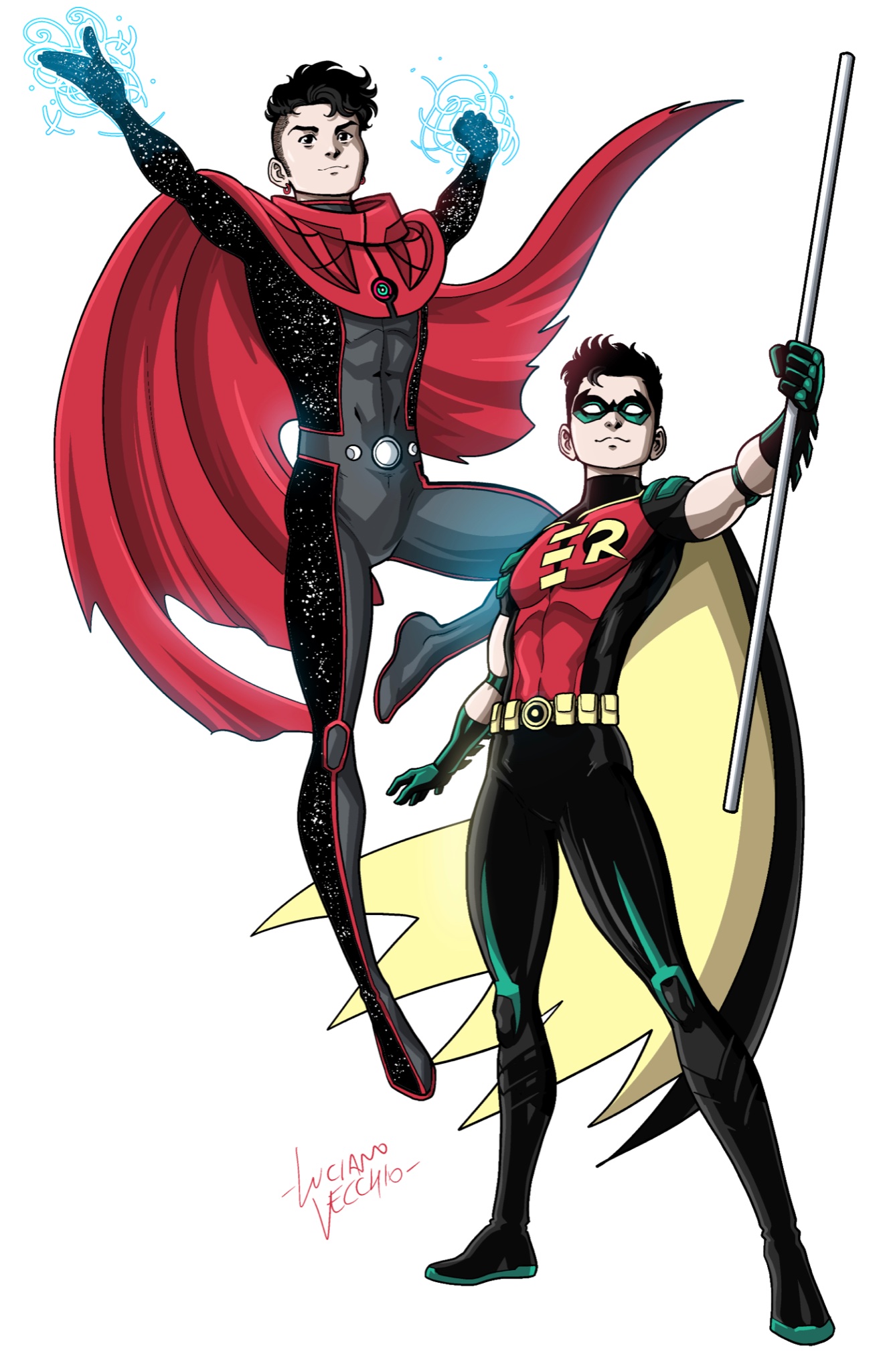 2boys avengers_(series) batman_(series) black_hair bodysuit cape child closed_mouth commentary commission crossover dc_comics domino_mask english_commentary eye_mask fantasy floating flying full_body gloves green_mask highleg highleg_leotard highres holding holding_staff holding_weapon leotard long_sleeves lucianovecchio magic male_focus marvel mask multiple_boys outstretched_arm robin_(dc) simple_background skin_tight staff superhero_costume tim_drake weapon white_background wiccan young_avengers
