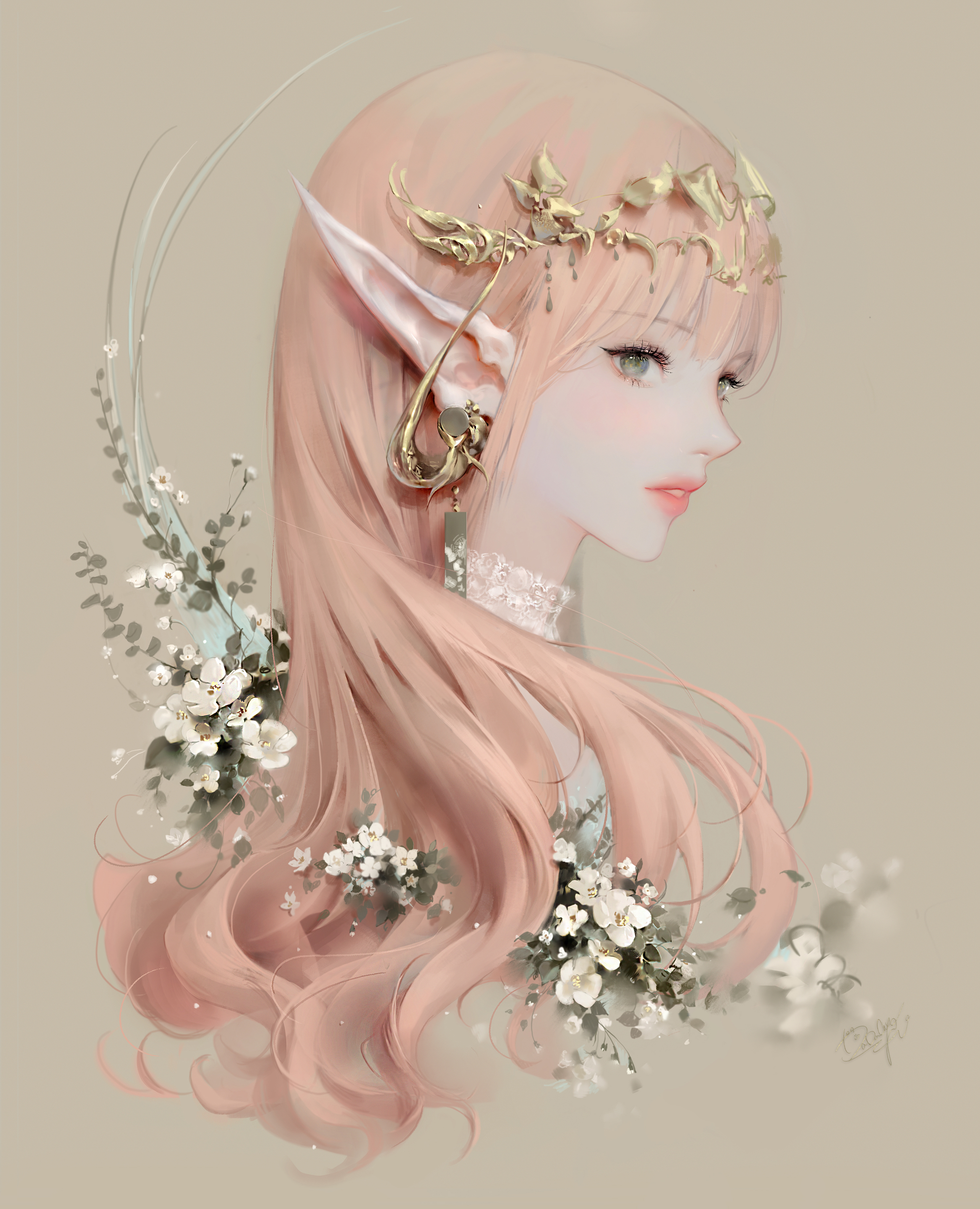 1girl absurdres brown_background cropped_shoulders dadachyo earrings flower green_eyes highres jewelry light_brown_hair lips long_hair long_pointy_ears looking_at_viewer original parted_lips pink_lips pointy_ears signature solo