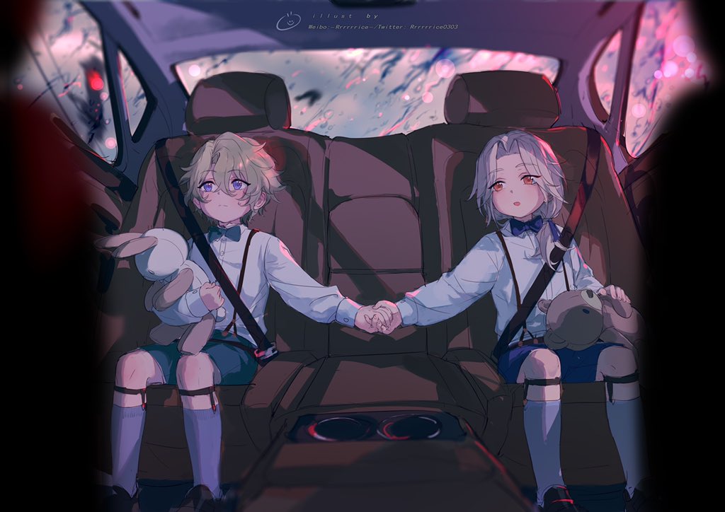 2boys :o aged_down black_footwear blonde_hair blue_bow blue_bowtie blue_shorts blurry blush bow bowtie car_interior child closed_mouth collared_shirt depth_of_field dress_shirt ensemble_stars! frown green_bow green_bowtie green_shorts grey_hair grey_legwear hair_between_eyes hair_over_shoulder holding holding_hands holding_stuffed_toy kneehighs legwear_garter long_hair long_sleeves looking_away low_ponytail male_focus multiple_boys outstretched_arm parted_bangs ponytail purple_eyes rain ran_nagisa red_eyes rrr_(reason) seatbelt shirt shoes short_hair shorts sitting socks storm stuffed_animal stuffed_rabbit stuffed_toy suspender_shorts suspenders teddy_bear tomoe_hiyori traffic_light watermark web_address white_shirt