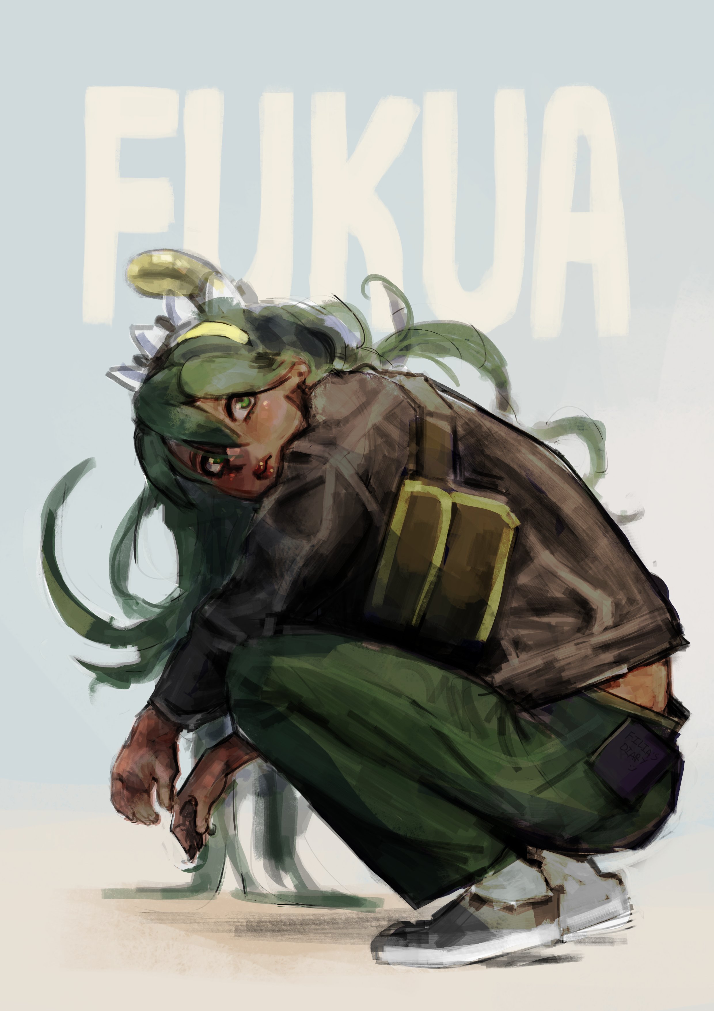 1girl absurdres alternate_costume character_name dark-skinned_female dark_skin from_side fukua_(skullgirls) full_body green_eyes green_hair highres jacket long_tongue looking_to_the_side red_lips shamone_(skullgirls) sharp_teeth skullgirls solo squatting squiiiiiiiigly teeth tongue tongue_out