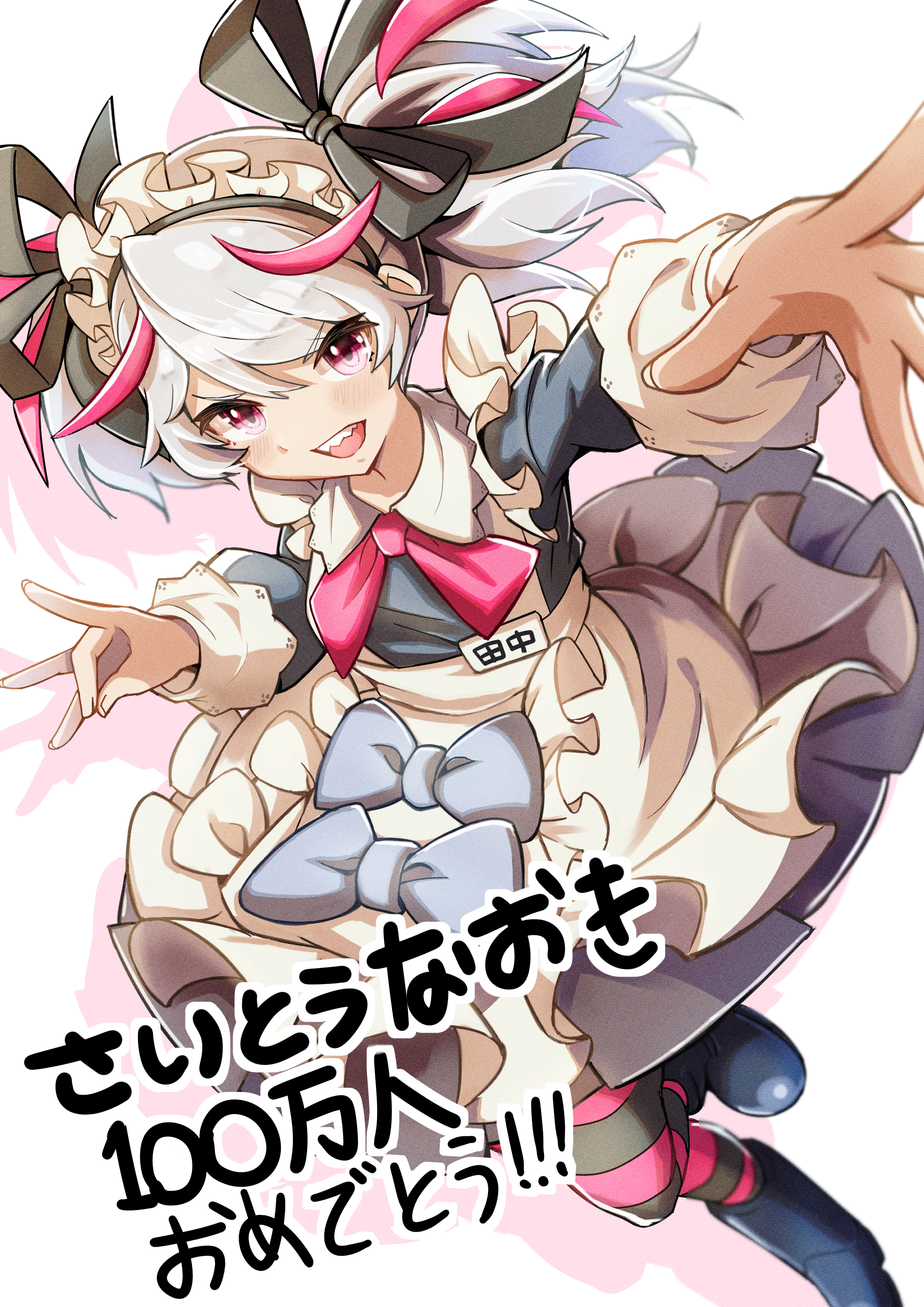 1girl absurdres black_ribbon blue_bow borrowed_character bow commentary_request copyright_request eat_some_cookie grey_hair hair_ribbon highres long_sleeves looking_at_viewer maid maid_headdress open_mouth pink_eyes ribbon sharp_teeth smile striped_clothes striped_thighhighs teeth thighhighs translation_request twintails upper_teeth_only