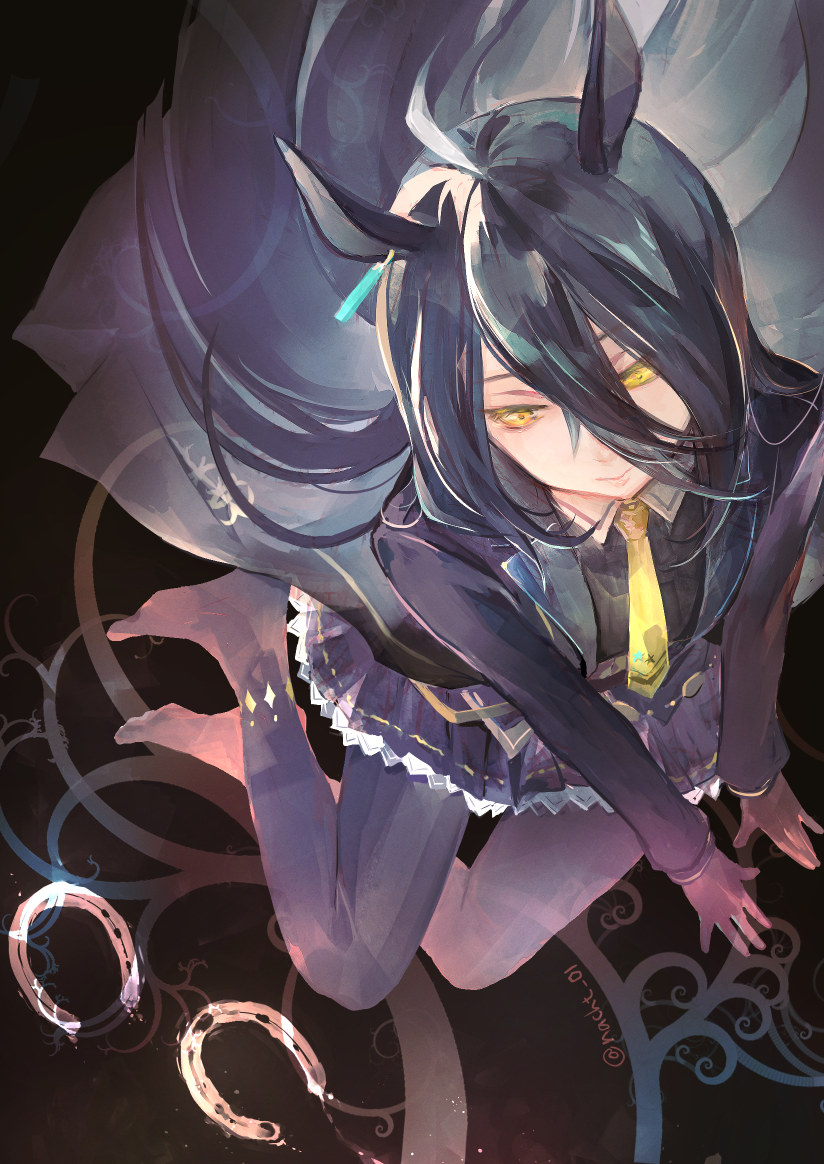 1girl animal_ears black_gloves black_hair black_jacket black_pantyhose black_skirt closed_mouth full_body gloves horse_ears horse_girl jacket long_hair long_sleeves manhattan_cafe_(umamusume) nacht_(nacht_01) necktie pantyhose pleated_skirt skirt solo umamusume yellow_eyes yellow_necktie