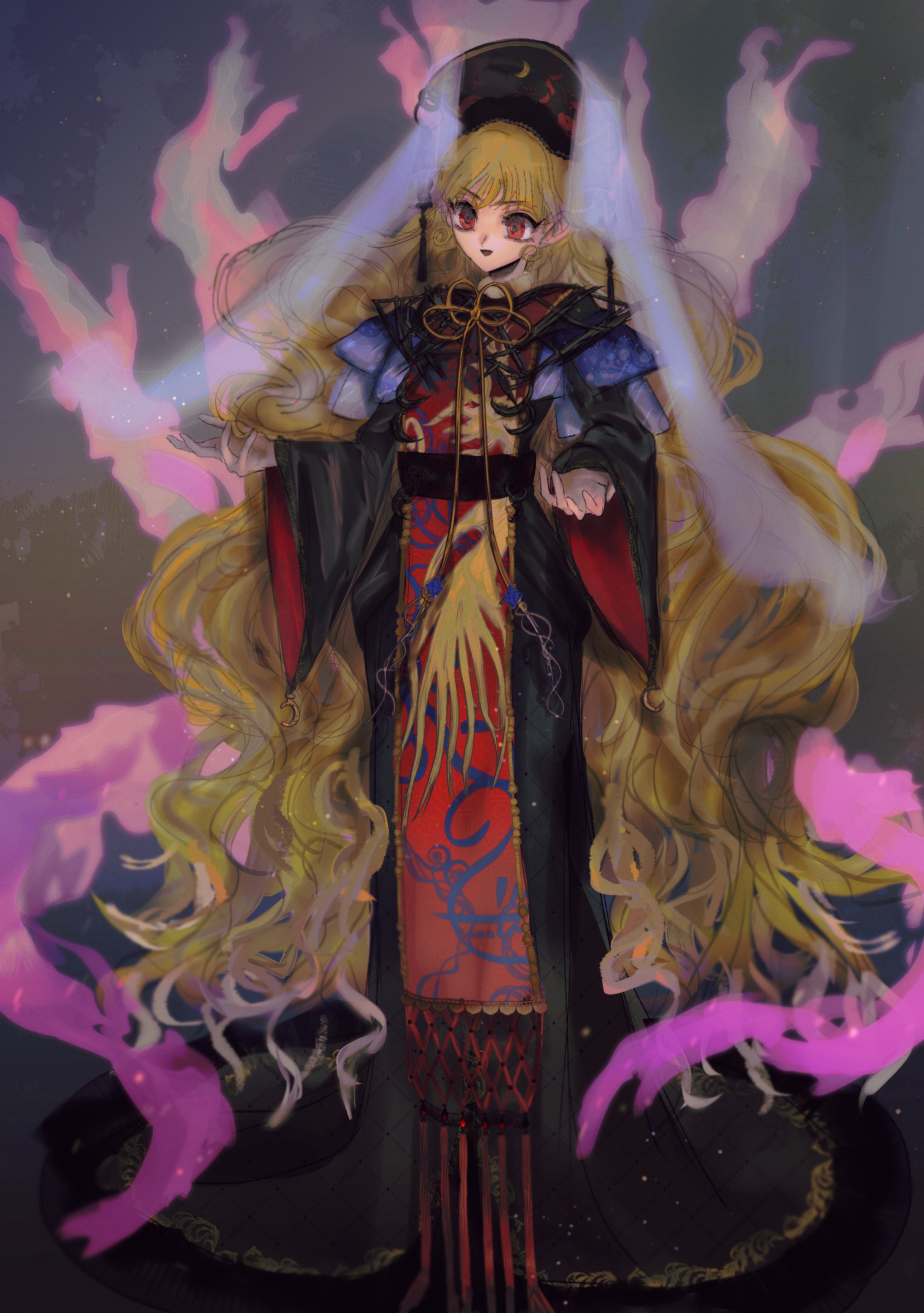 1girl :d absurdly_long_hair absurdres black_dress blonde_hair chinese_clothes dress energy full_body hat highres junko_(touhou) long_hair long_sleeves open_mouth red_eyes sash simple_background smile solo tabard touhou very_long_hair wide_sleeves yukama_(blackwaltz)