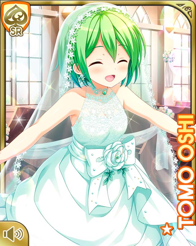 1girl bow brown_eyes card_(medium) character_name closed_eyes day dress flower girlfriend_(kari) green_hair indoors looking_at_viewer official_art open_mouth oshi_tomo qp:flapper rose smile solo wedding_dress white_bow white_dress white_flower white_rose