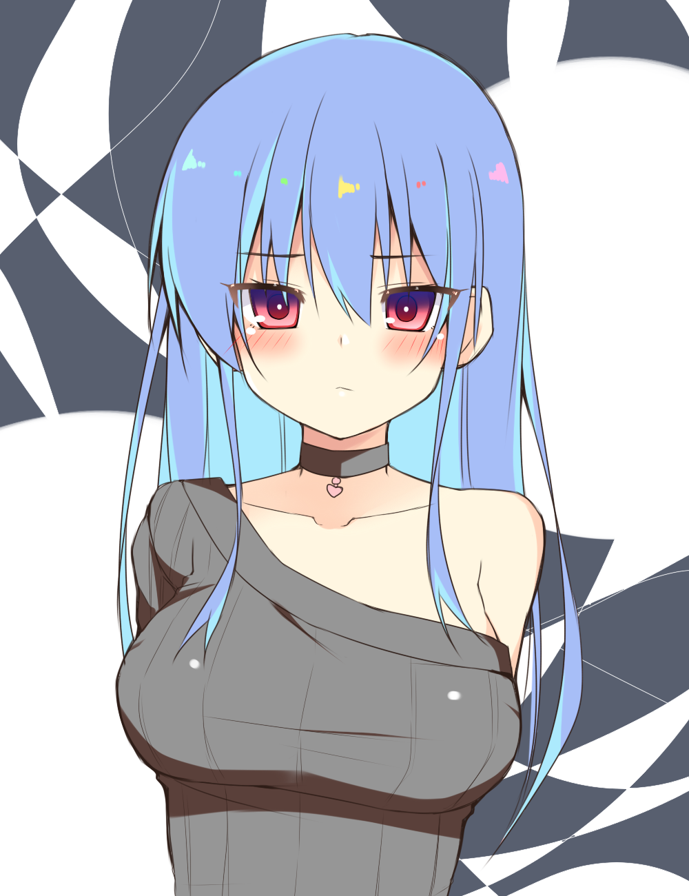 1girl bare_shoulders blue_hair blush breasts choker dot_nose frown grey_choker hair_between_eyes highres kinokohaman long_hair looking_at_viewer medium_breasts off_shoulder original red_eyes solo tagme upper_body