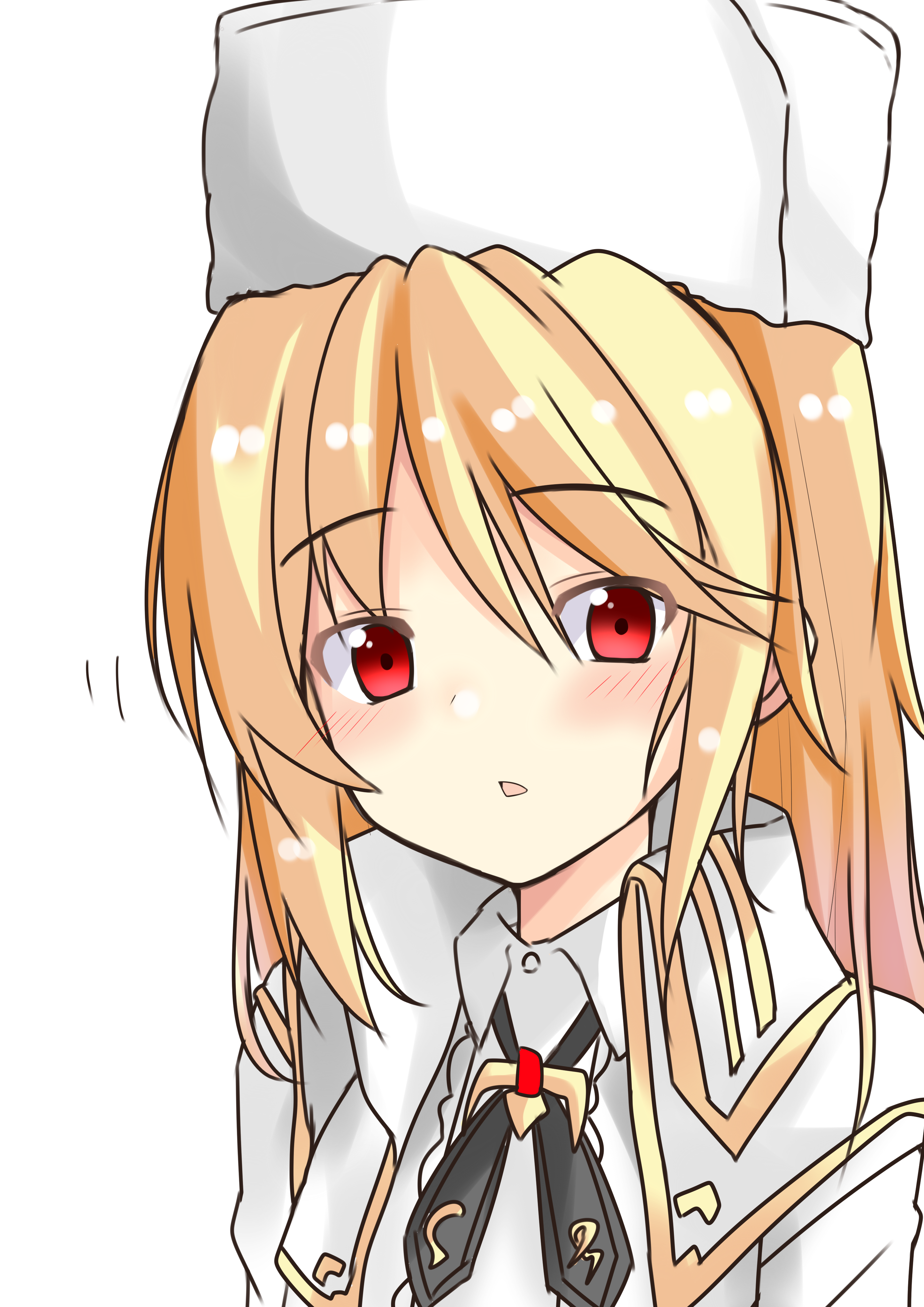 1girl absurdres blonde_hair blush dot_nose girls'_frontline hat highres kinokohaman nagant_revolver_(girls'_frontline) red_eyes simple_background solo tagme white_background white_hat