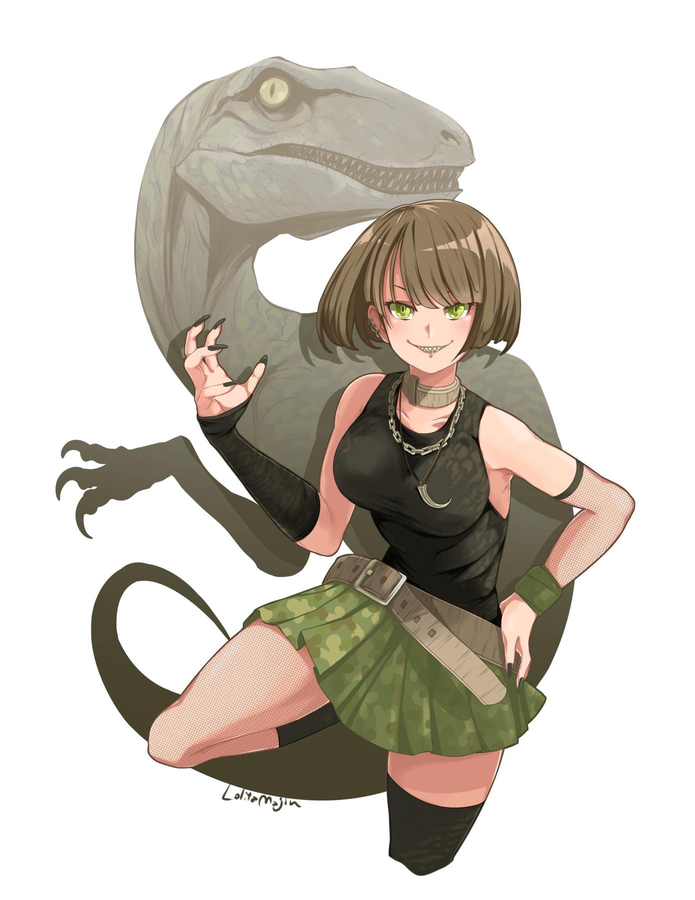 1girl asymmetrical_legwear belt black_nails black_shirt black_thighhighs breasts brown_belt brown_hair dinosaur earrings fishnet_thighhighs fishnets green_eyes green_skirt highres jewelry jurassic_park large_breasts lolita_majin miniskirt nail_polish necklace original personification pleated_skirt sharp_teeth shirt short_hair single_leg_pantyhose single_thighhigh skirt sleeveless sleeveless_shirt slit_pupils teeth thighhighs transparent_background velociraptor