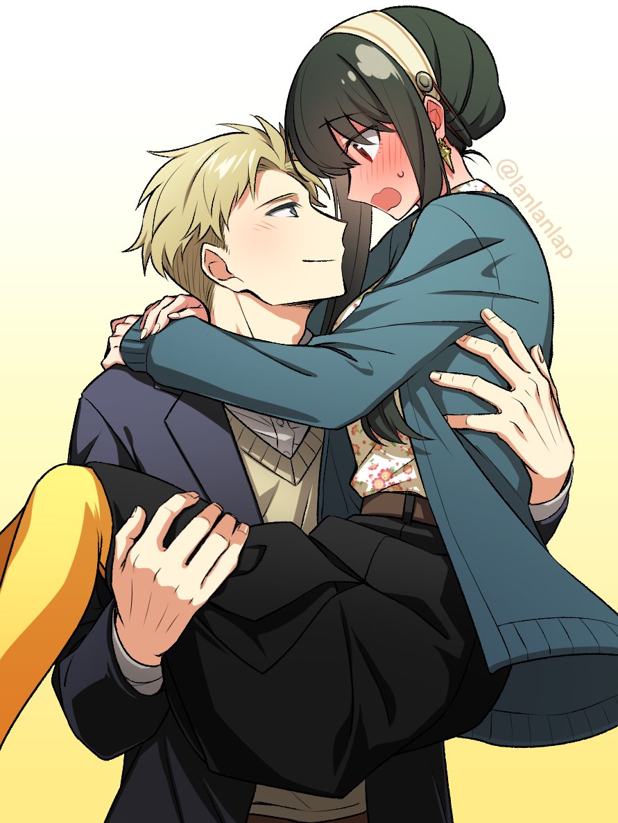 1boy 1girl belt black_skirt blazer blonde_hair blue_jacket blush breasts cardigan carrying collared_shirt dress_shirt earrings eye_contact face-to-face floral_print full-face_blush gradient_background green_eyes hand_on_another's_back hand_on_another's_shoulder hand_on_another's_thigh hetero jacket jewelry lanlanlap long_hair long_sleeves looking_at_another open_clothes open_jacket open_mouth outstretched_arms own_hands_together pantyhose princess_carry profile red_eyes shirt short_hair sidelocks skirt smile spy_x_family sweater_vest twilight_(spy_x_family) twitter_username updo wavy_mouth white_shirt yellow_pantyhose yor_briar