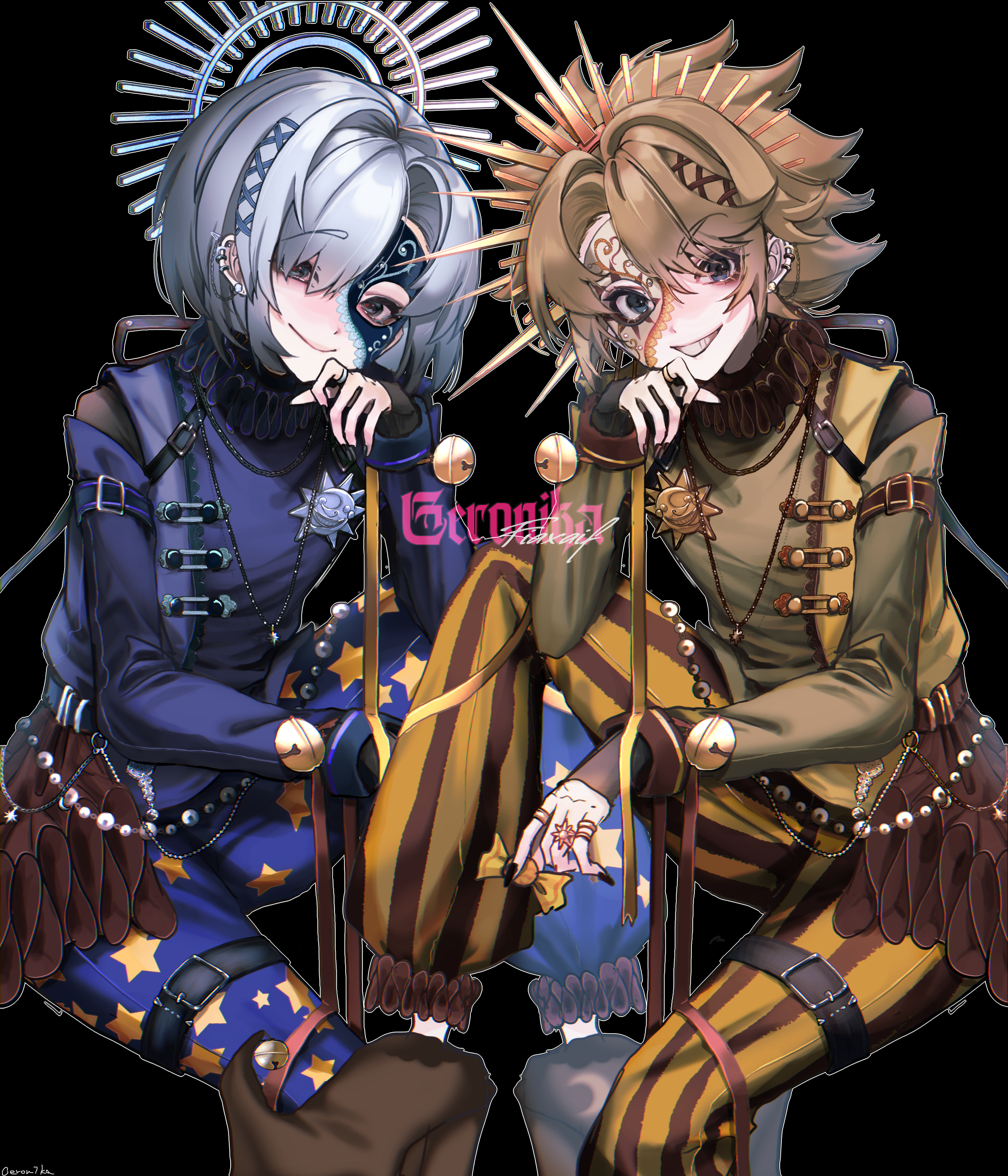 2boys absurdres baggy_pants belt blonde_hair five_nights_at_freddy's five_nights_at_freddy's:_security_breach highres mask moon_(fnaf) multiple_boys pants personification piz_doll short_hair smile starry_sky_print striped_legwear sun_(fnaf) sun_symbol vertical-striped_legwear white_hair