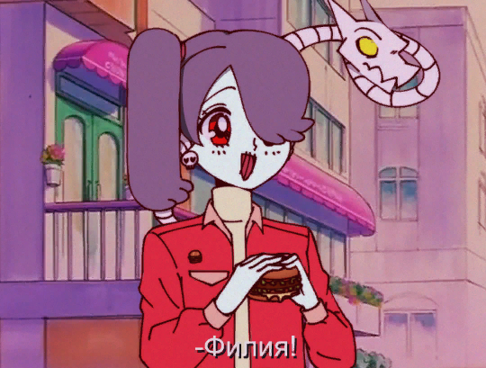 1990s_(style) 1girl burger cyrillic firemauer food holding open_mouth purple_hair red_eyes retro_artstyle short_hair skullgirls smile solo squigly_(skullgirls)
