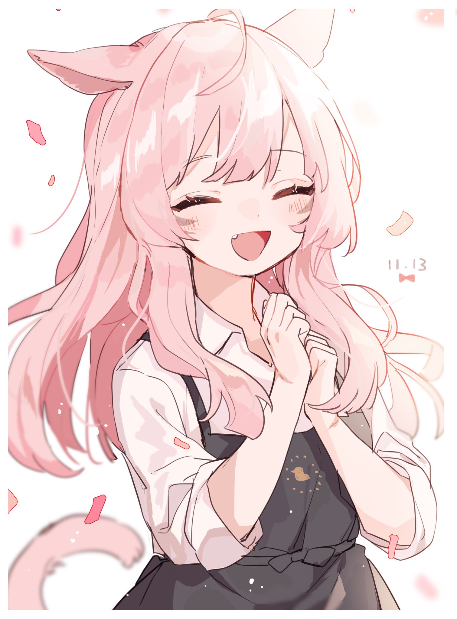 1girl :d ^_^ animal_ears apron warrior_of_light_(ff14) cat_ears cat_tail closed_eyes dated closed_eyes fang final_fantasy final_fantasy_xiv highres long_hair long_sleeves miqo'te mokyuko open_mouth pink_hair shirt smile tail white_shirt
