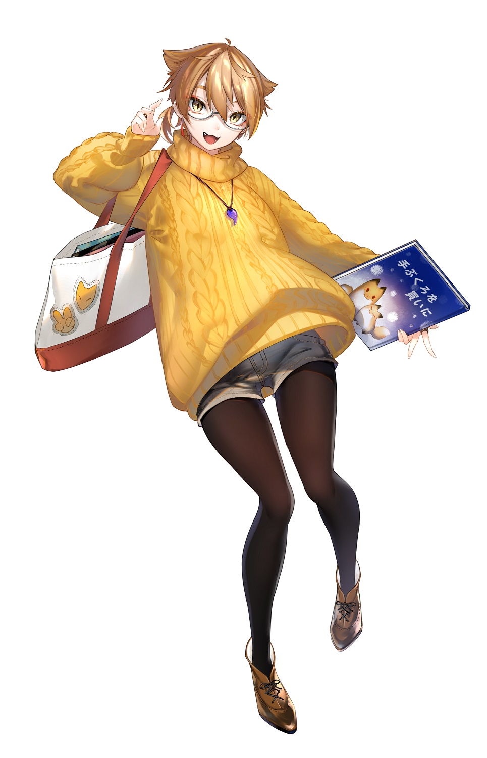 1girl :3 :d ahoge alternate_hair_length alternate_hairstyle ankle_boots aran_sweater arm_at_side bad_id bad_pixiv_id bag bespectacled black_pantyhose book boots brown_boots brown_hair cable_knit cross-laced_footwear earrings eyelashes eyeliner fang floating_hair fox full_body fushimi_gaku glasses hair_between_eyes hair_flaps hand_up highres holding holding_book jewelry leaning_back long_hair long_sleeves looking_at_viewer magatama magatama_necklace makeup mole mole_under_eye necklace nijisanji open_mouth pantyhose pantyhose_under_shorts pendant picture_book shorts shoulder_bag side_ponytail simple_background single_earring slit_pupils smile sweater sweater_vest turtleneck turtleneck_sweater virtual_youtuber white_background yatozume yellow_eyes yellow_sweater_vest