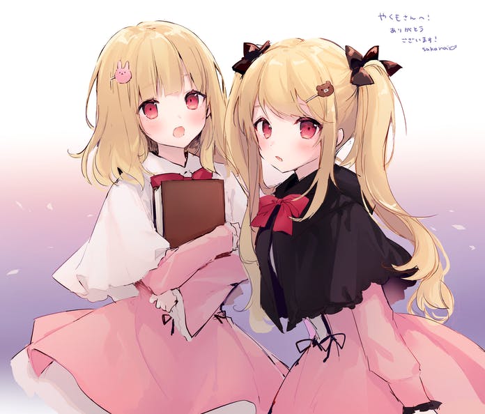 2girls blonde_hair blush capelet commission dress gradient_background hair_ribbon indie_virtual_youtuber looking_at_viewer matching_outfits multiple_girls open_mouth pink_eyes ribbon siblings sisters skeb_commission suzumori_uina twintails virtual_youtuber yozakura_mia yozakura_noa