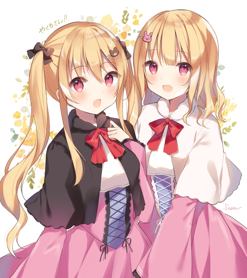 2girls blonde_hair blush capelet commission dress facing_viewer floral_background indie_virtual_youtuber long_sleeves looking_at_viewer matching_outfits multiple_girls open_mouth pink_dress pink_eyes shiino_sera siblings sisters skeb_commission virtual_youtuber white_background yozakura_mia yozakura_noa