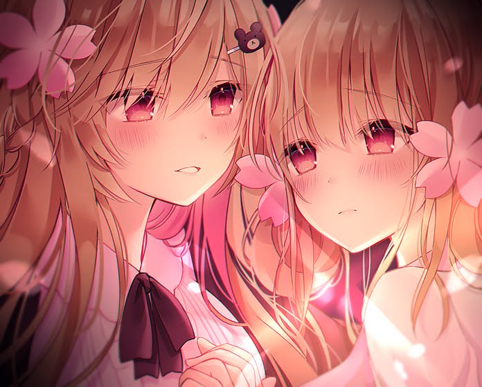 2girls blonde_hair blush closed_mouth commission flower frown hair_flower hair_ornament holding_hands indie_virtual_youtuber kuro_namako looking_at_another multiple_girls open_mouth pink_eyes siblings sisters skeb_commission smile virtual_youtuber yozakura_mia yozakura_noa