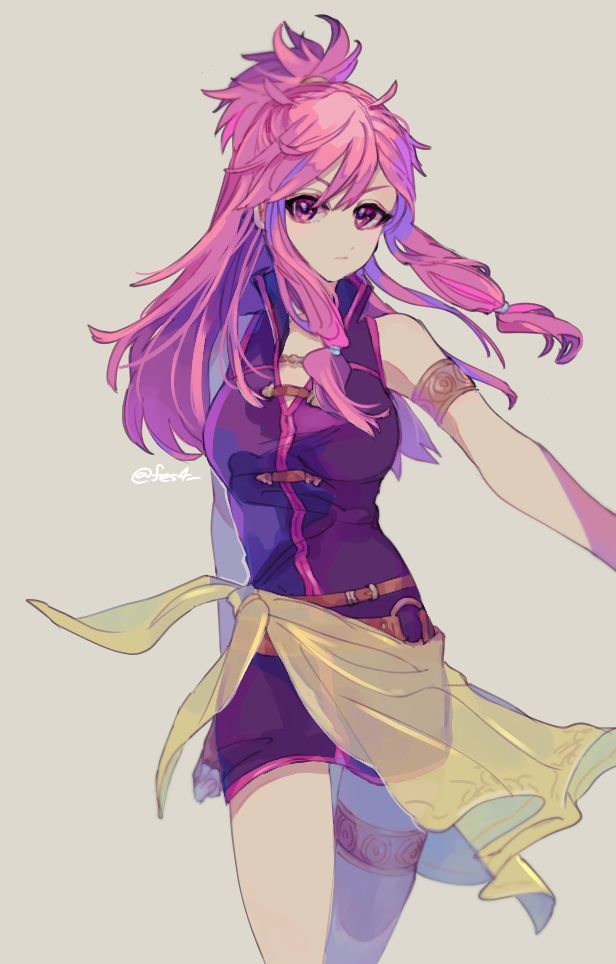 1girl armlet belt black_jacket black_skirt breasts brown_belt closed_mouth cowboy_shot fes4 fire_emblem fire_emblem:_the_sacred_stones floating_hair grey_background hair_between_eyes jacket jewelry long_hair marisa_(fire_emblem) medium_breasts miniskirt nintendo pencil_skirt pink_eyes pink_hair simple_background sketch skindentation skirt sleeveless sleeveless_jacket solo standing thigh_gap thighlet very_long_hair