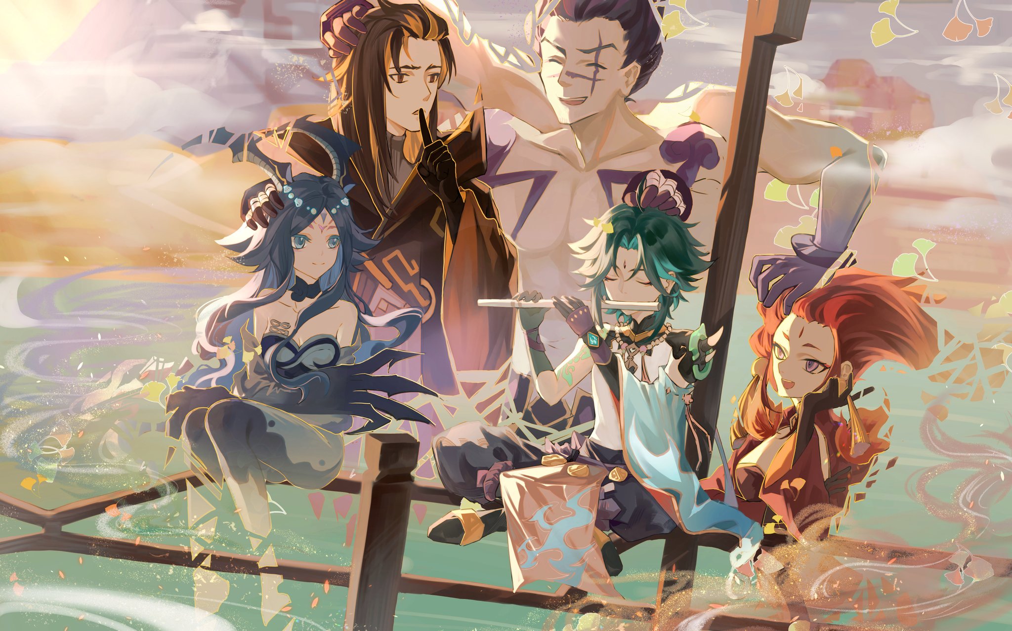 2girls 3boys blue_hair bonanus_(genshin_impact) bosacius_(genshin_impact) chiu_0426 claws closed_eyes flute genshin_impact highres horns indarias_(genshin_impact) instrument menogias_(genshin_impact) multicolored_hair multiple_boys multiple_girls red_hair smile tattoo xiao_(genshin_impact)