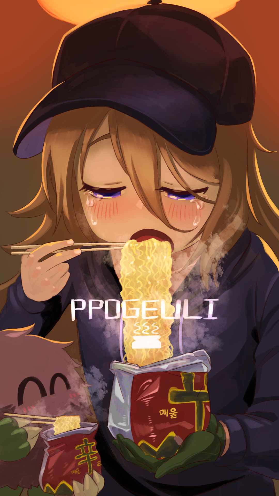 1girl bag blush brown_hair chopsticks closed_eyes creature crying crying_with_eyes_open duel_monster eating fingernails food gloves green_gloves hair_between_eyes half-closed_eyes hat highres holding holding_bag holding_chopsticks hood hood_down hoodie instant_noodles instant_pack_noodles instant_ramen kuriboh light_brown_hair long_hair noodles open_mouth original purple_eyes purple_headwear purple_hoodie ramen steam tearing_up tears wootsang yu-gi-oh!