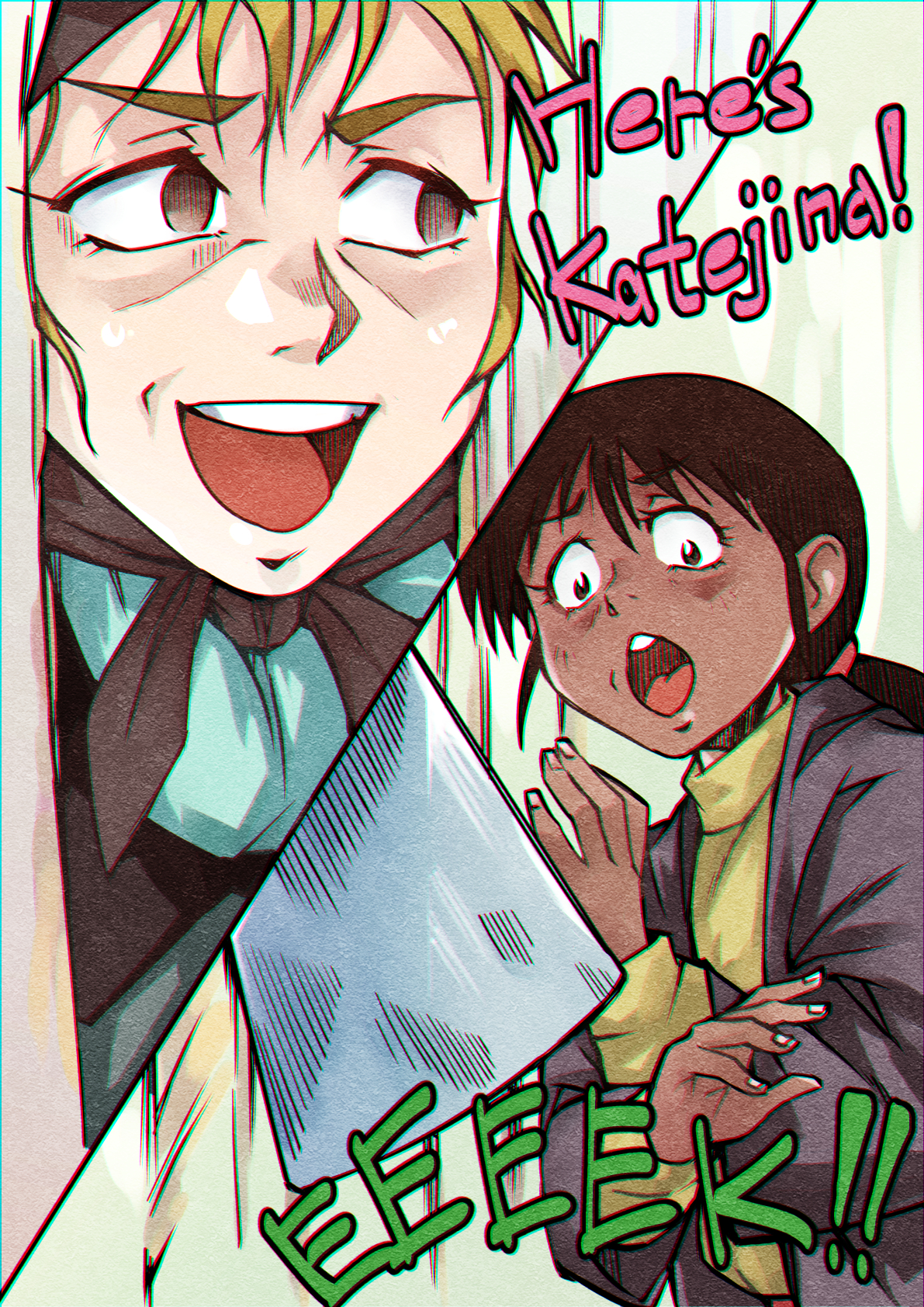 2girls axe blank_eyes blonde_hair brown_eyes brown_hair commentary door english_text gundam handkerchief here's_johnny!_(meme) highres katejina_loos meme multiple_girls open_mouth ponytail saika_(pixiv43370196) screaming shakti_kareen the_shining victory_gundam