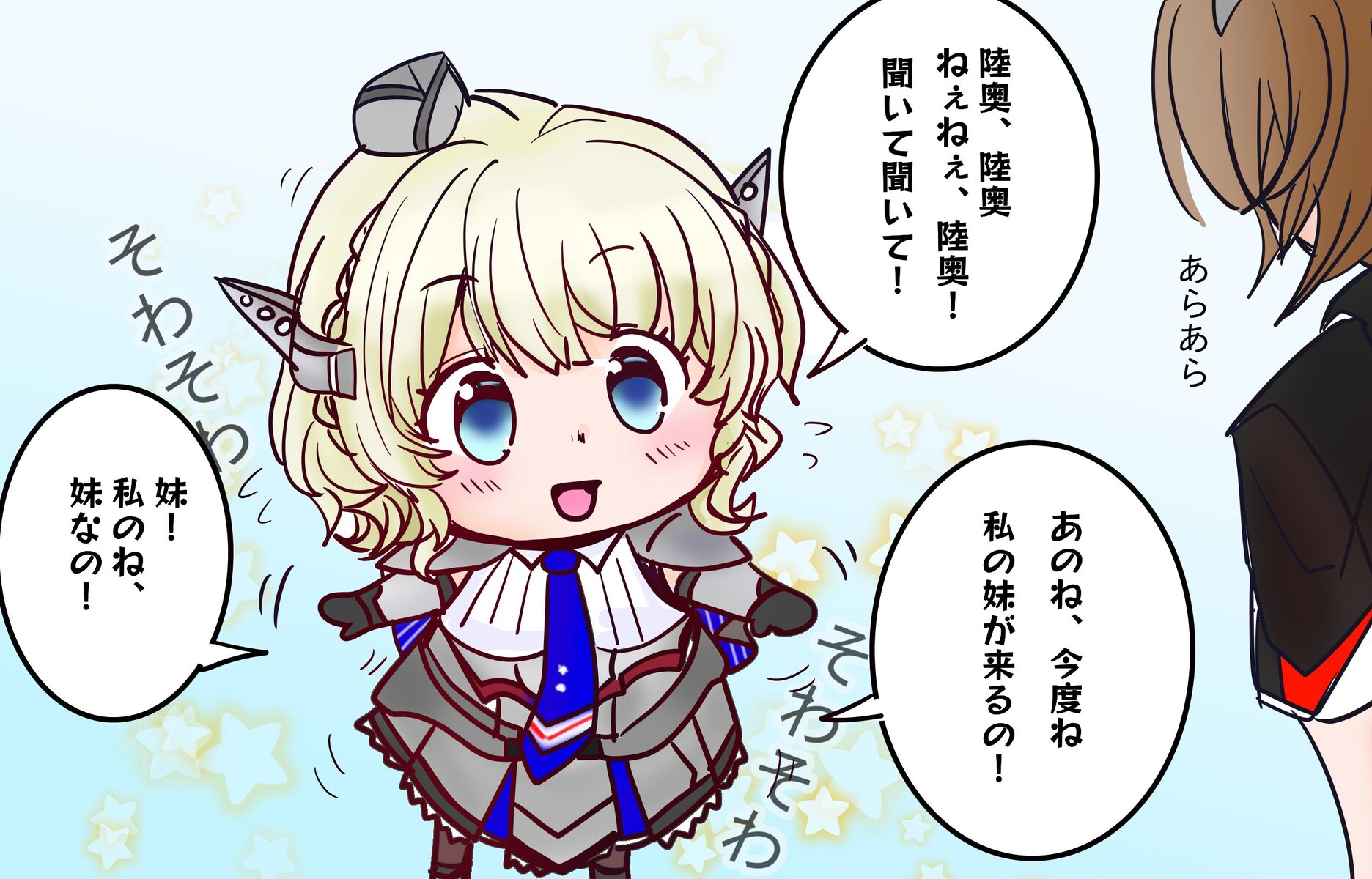 2girls :d black_gloves black_legwear blonde_hair blue_background blue_eyes blue_necktie blush braid brown_hair chibi colorado_(kancolle) drawfag garrison_cap gloves gradient_background grey_headwear hat headgear highres kantai_collection multiple_girls mutsu_(kancolle) mutsu_kai_ni_(kancolle) necktie open_mouth short_hair side_braids smile solo_focus star_(symbol) third-party_source translated