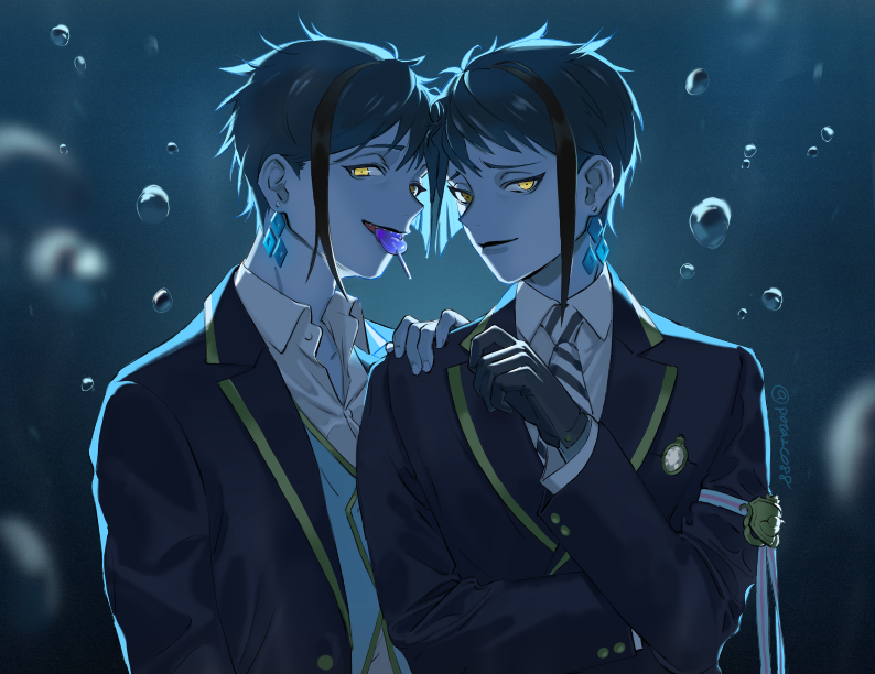 2boys air_bubble arm_at_side arm_up backlighting black_gloves black_hair black_jacket blue_hair blue_skin blue_vest blurry brooch brothers bubble candy collared_shirt colored_skin depth_of_field diamond_(shape) earrings floyd_leech food gloves hand_on_another's_shoulder hand_up jacket jade_leech jewelry lollipop long_sleeves looking_at_viewer male_focus motion_blur mouth_hold multicolored_hair multiple_boys necktie night_raven_college_school_uniform parted_lips pota2co88 shirt short_hair short_hair_with_long_locks siblings sidelocks sideways_glance smirk streaked_hair striped_clothes striped_necktie submerged twins twisted_wonderland twitter_username upper_body vest yellow_eyes