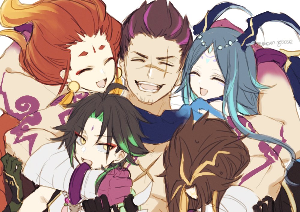 2girls 3boys :d bonanus_(genshin_impact) bosacius_(genshin_impact) closed_eyes facial_mark forehead_mark genshin_impact head_down horns indarias_(genshin_impact) maka_(morphine) menogias_(genshin_impact) multicolored_hair multiple_boys multiple_girls open_mouth scar scar_on_face scarf smile tattoo xiao_(genshin_impact)