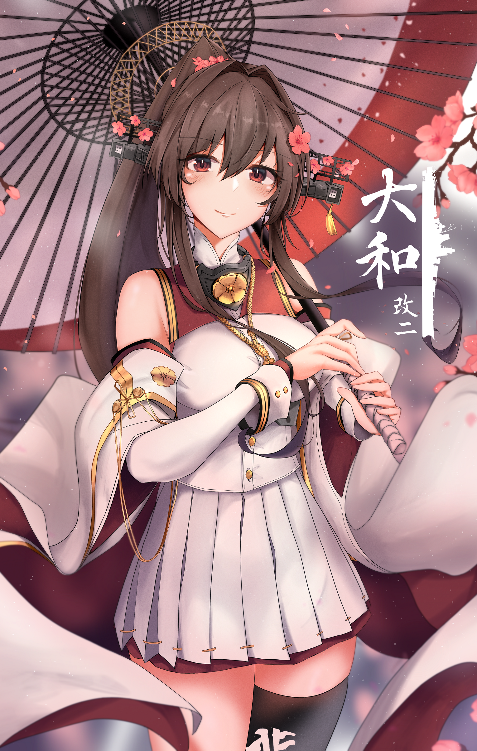 1girl absurdres black_thighhighs blush boots brown_eyes brown_hair cherry_blossoms closed_mouth clothing_cutout coat coat_on_shoulders collar cowboy_shot flower hair_between_eyes hair_flower hair_intakes hair_ornament highres holding holding_umbrella jenson_tw kantai_collection long_coat long_hair metal_collar multicolored_umbrella oil-paper_umbrella pleated_skirt ponytail red_eyes red_umbrella shoulder_cutout sidelocks single_thigh_boot single_thighhigh skirt sleeveless sleeveless_coat smile solo standing thigh_boots thighhighs umbrella white_coat white_skirt white_umbrella yamato_(kancolle) yamato_kai_ni_(kancolle)