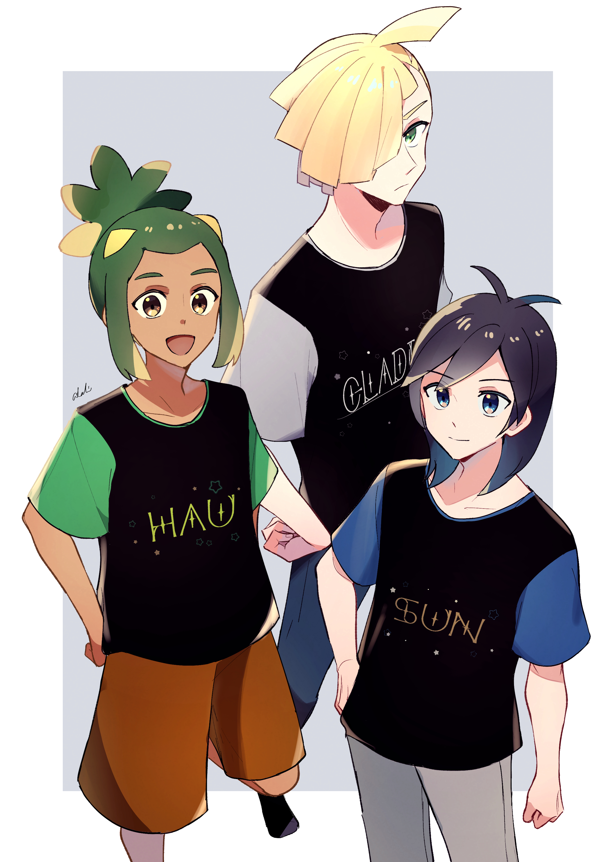 3boys absurdres ahoge alternate_costume antenna_hair black_hair blonde_hair border brown_shorts character_name closed_mouth collarbone commentary_request dark-skinned_male dark_skin elio_(pokemon) gladion_(pokemon) green_eyes green_hair grey_background grey_pants hau_(pokemon) highres male_focus medium_hair multiple_boys nintendo pants pokemon pokemon_sun_and_moon ponytail shirt short_hair short_ponytail short_sleeves shorts signature smile tere_asahi white_border