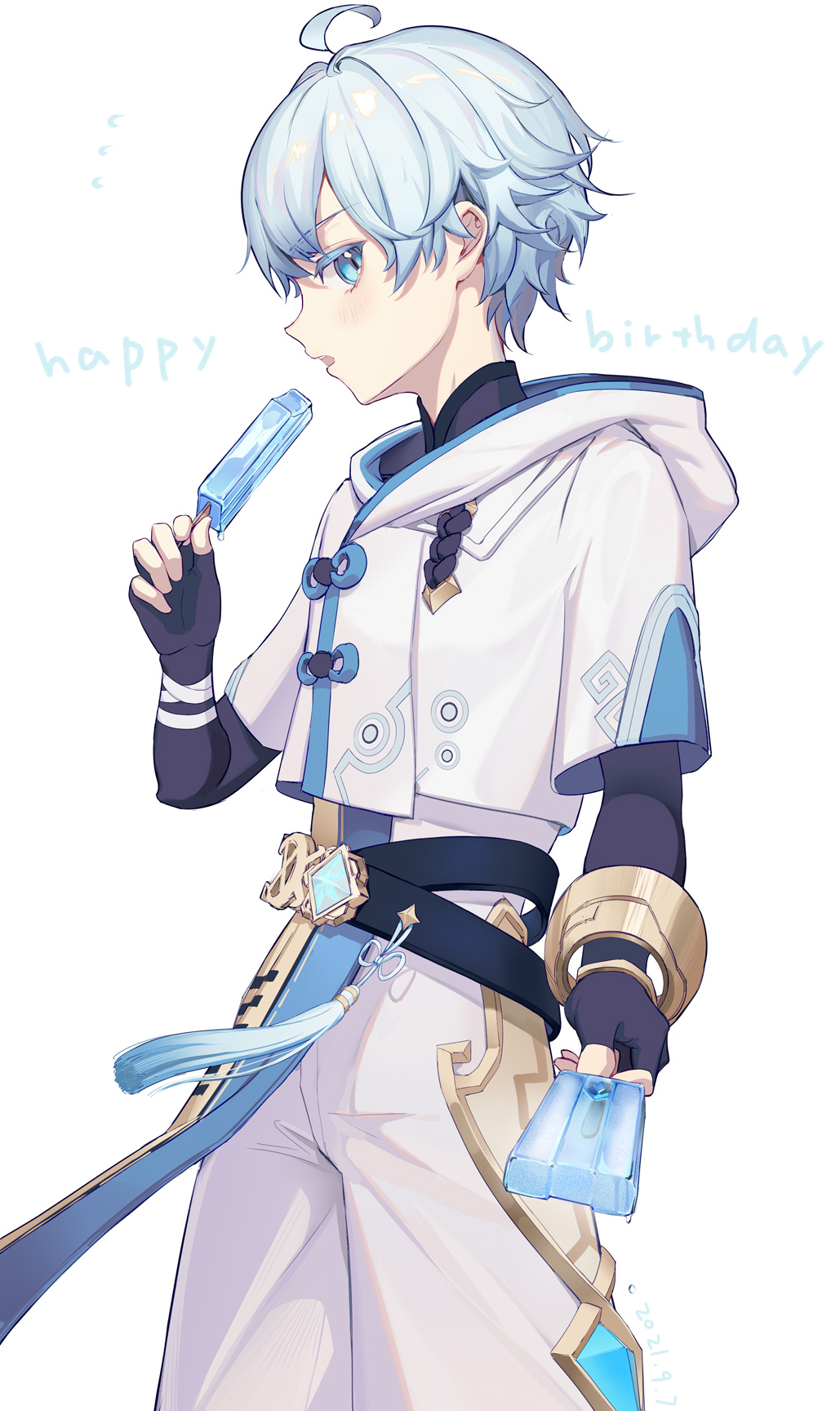 1boy blue_eyes blue_hair child chinese_clothes chongyun_(genshin_impact) commentary commentary_request eating fingerless_gloves food fruit genshin_impact gloves hair_between_eyes happy_birthday highres holding holding_food male_focus popsicle short_hair solo untranslatable_commentary vanink
