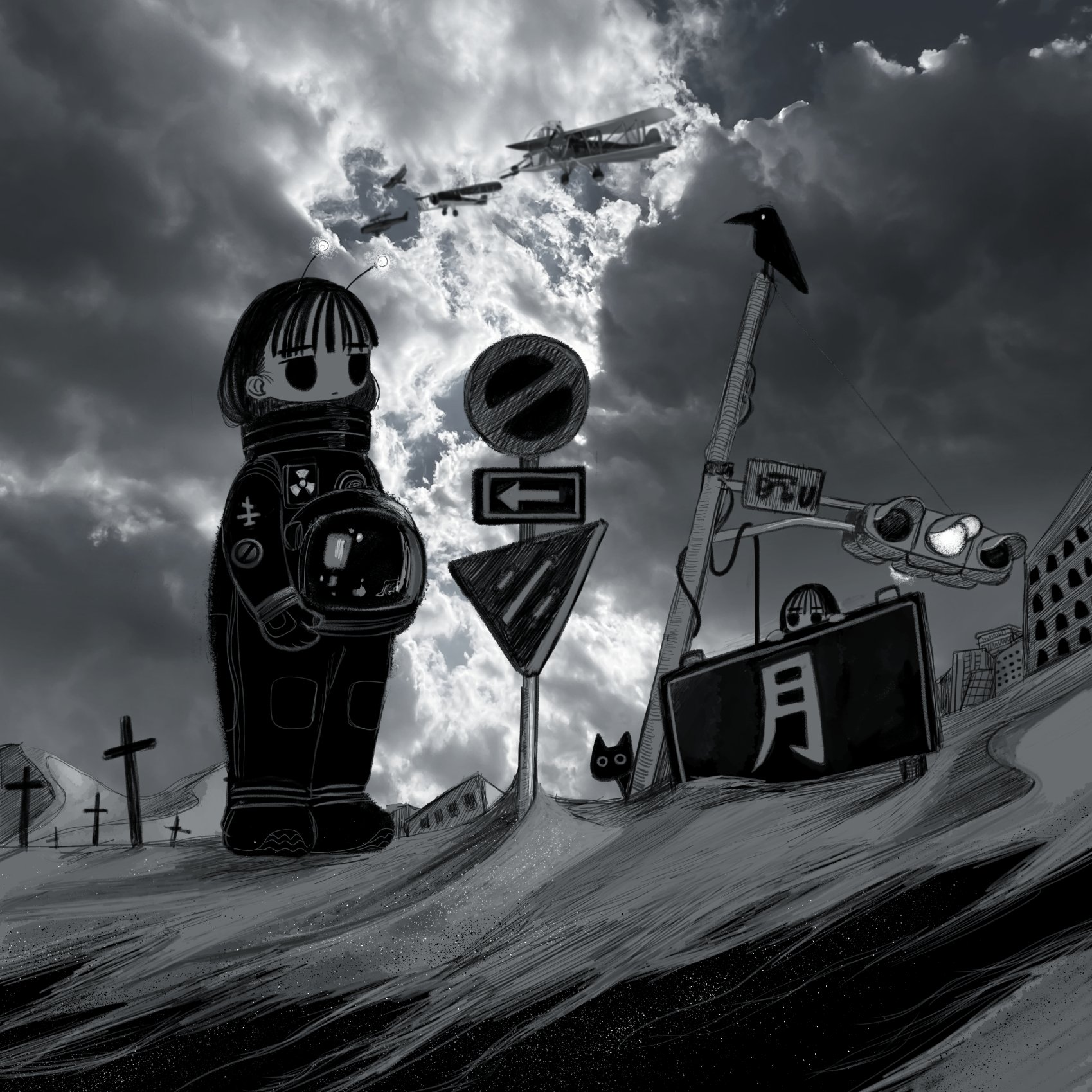 aircraft airplane alien antennae bird building cloud cross greyscale helmet highres holding holding_unworn_helmet monochrome narue original radiation_symbol road_sign sign space_helmet spacesuit traffic_light unworn_helmet